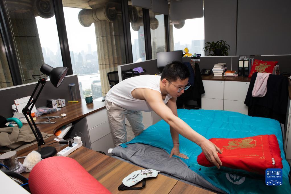 5月4日,在浦东陆家嘴平安金融大厦,平安资产管理有限责任公司员工田兵兵在收拾搭在办公室里的床铺。自4月17日起,他加入“值守队”,入住公司。