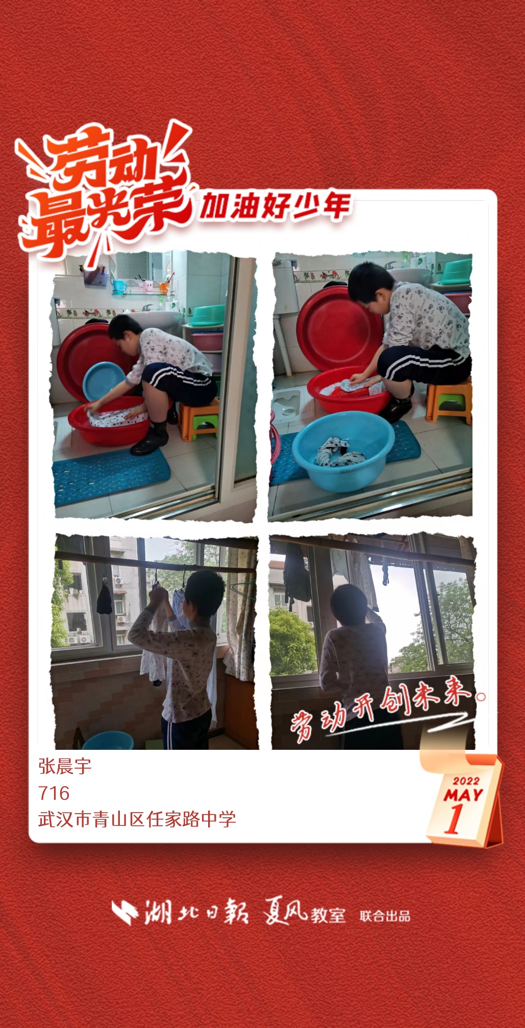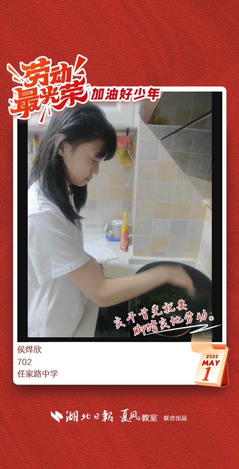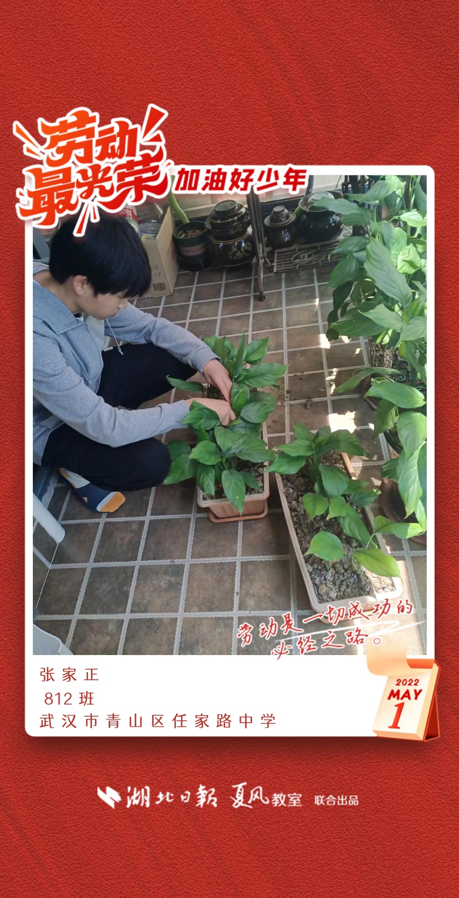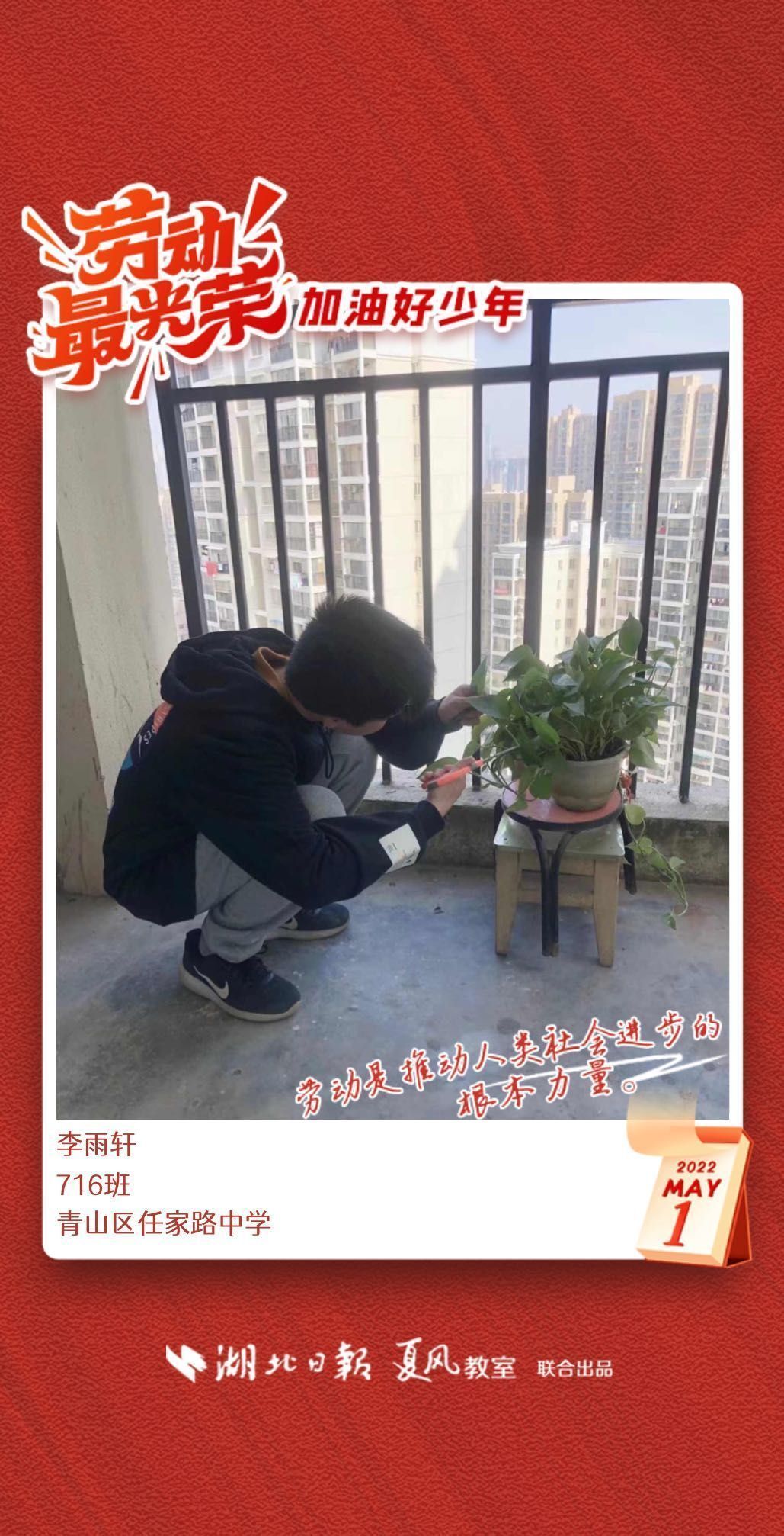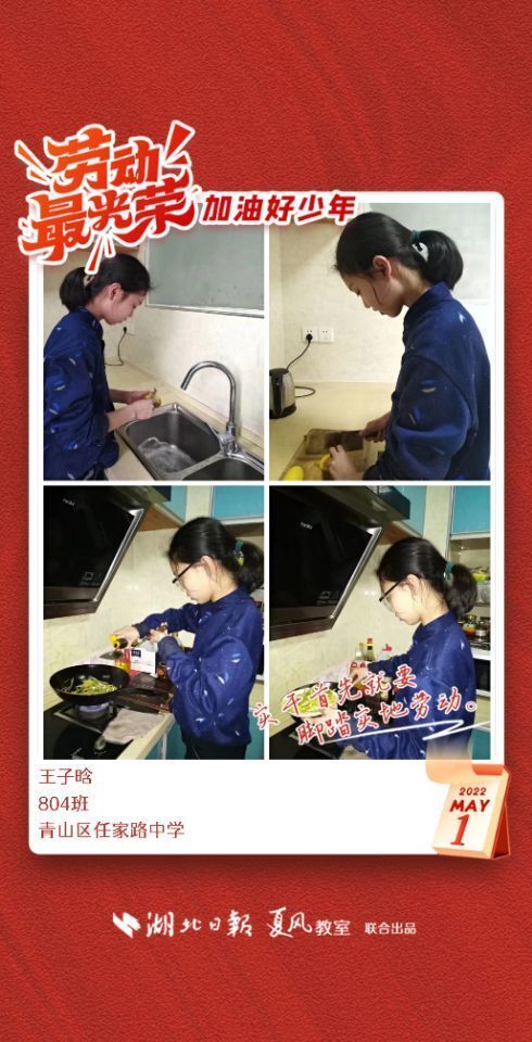 劳动是生活的基础,也是幸福的源泉。在“五一”劳动节来临之际,武汉市任家路中学号召学生自主选择一种劳动方式,完成“一份特别的劳动节作业”。