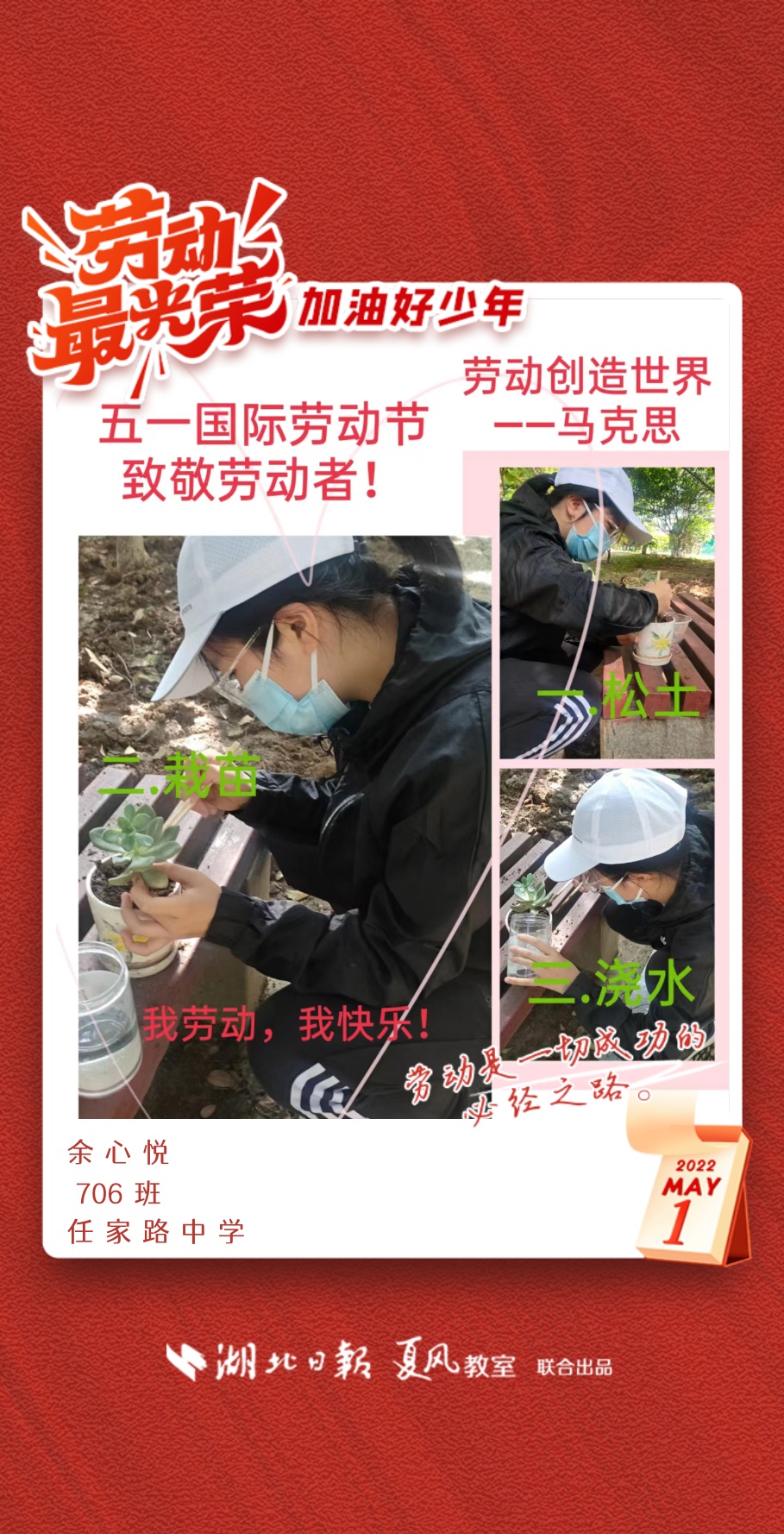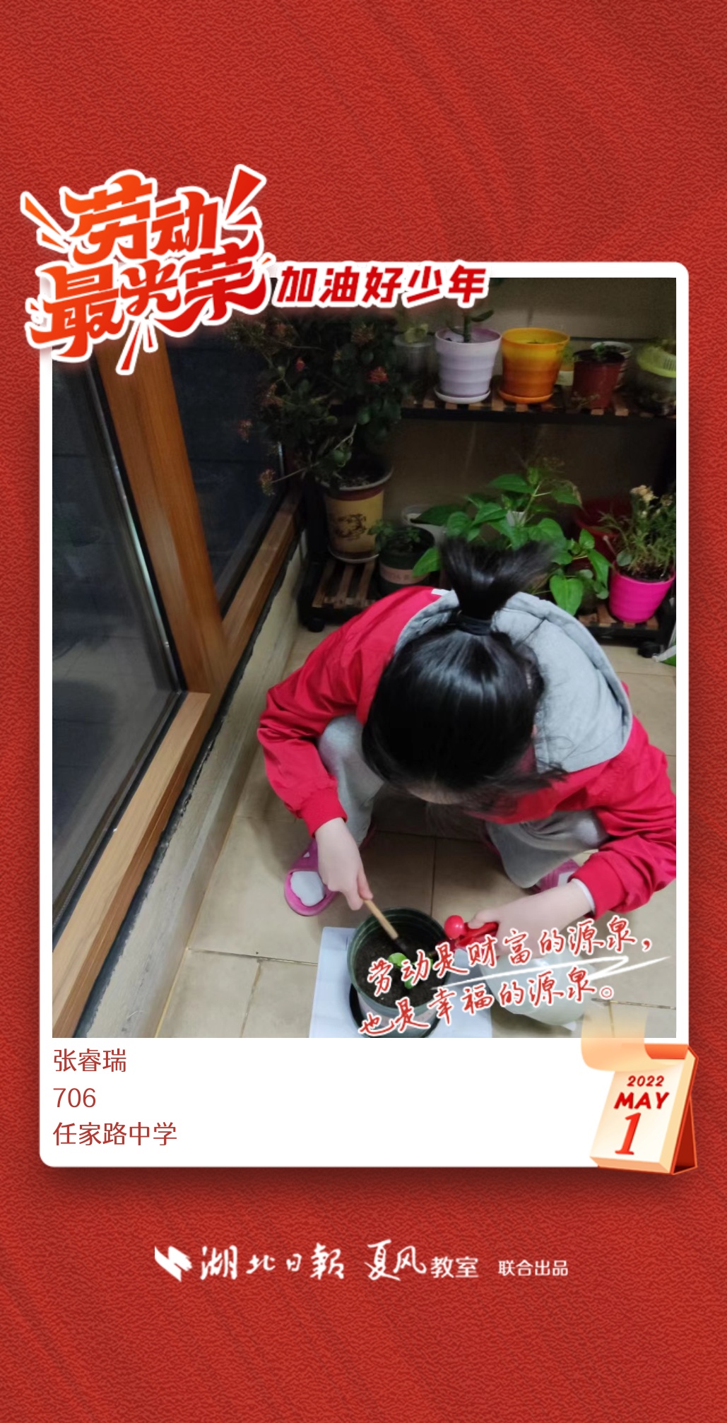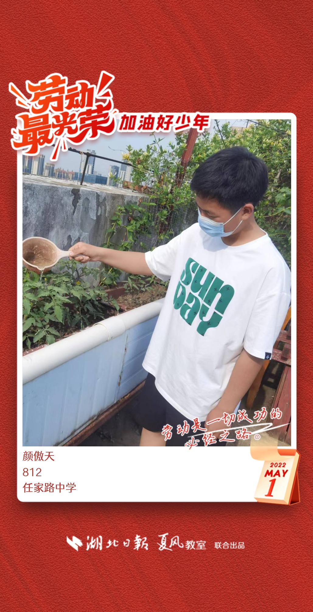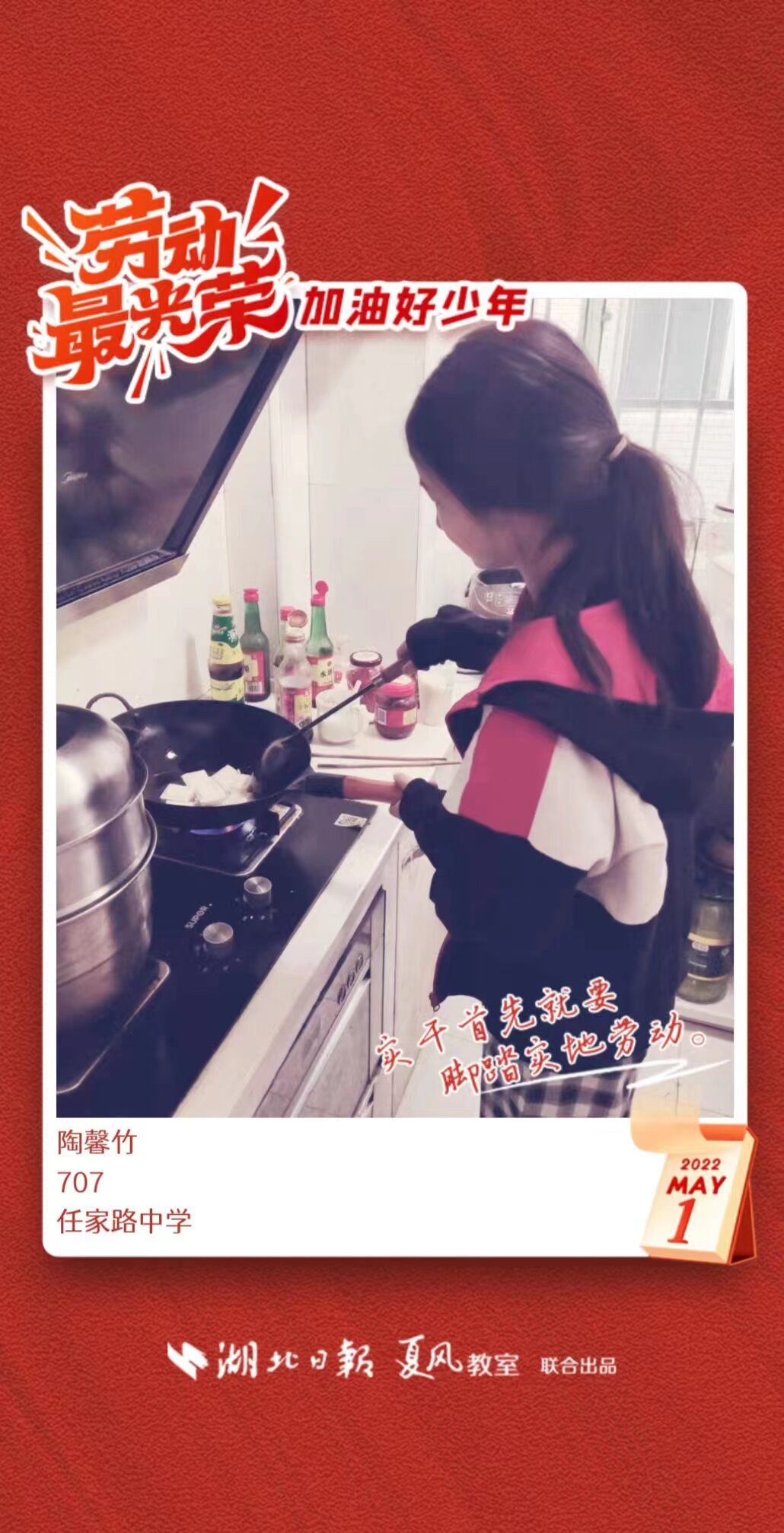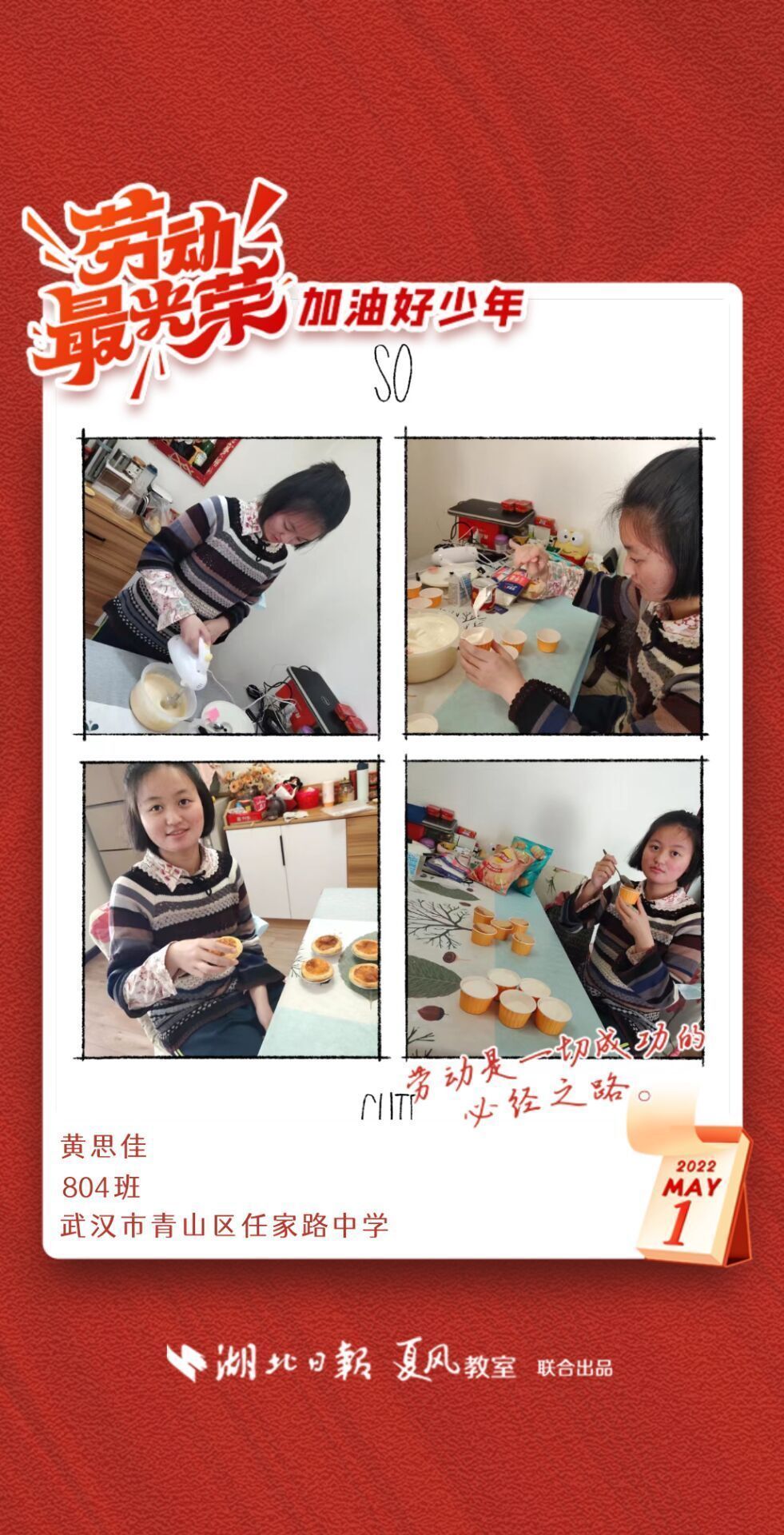 劳动是生活的基础,也是幸福的源泉。在“五一”劳动节来临之际,武汉市任家路中学号召学生自主选择一种劳动方式,完成“一份特别的劳动节作业”。