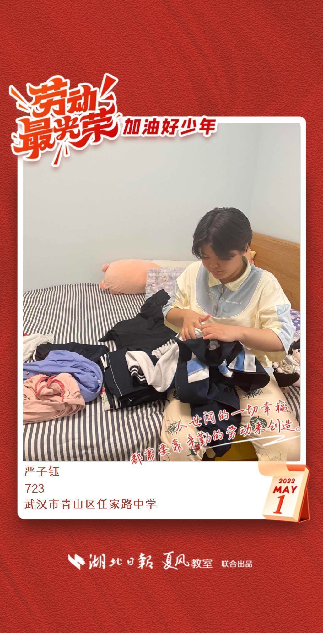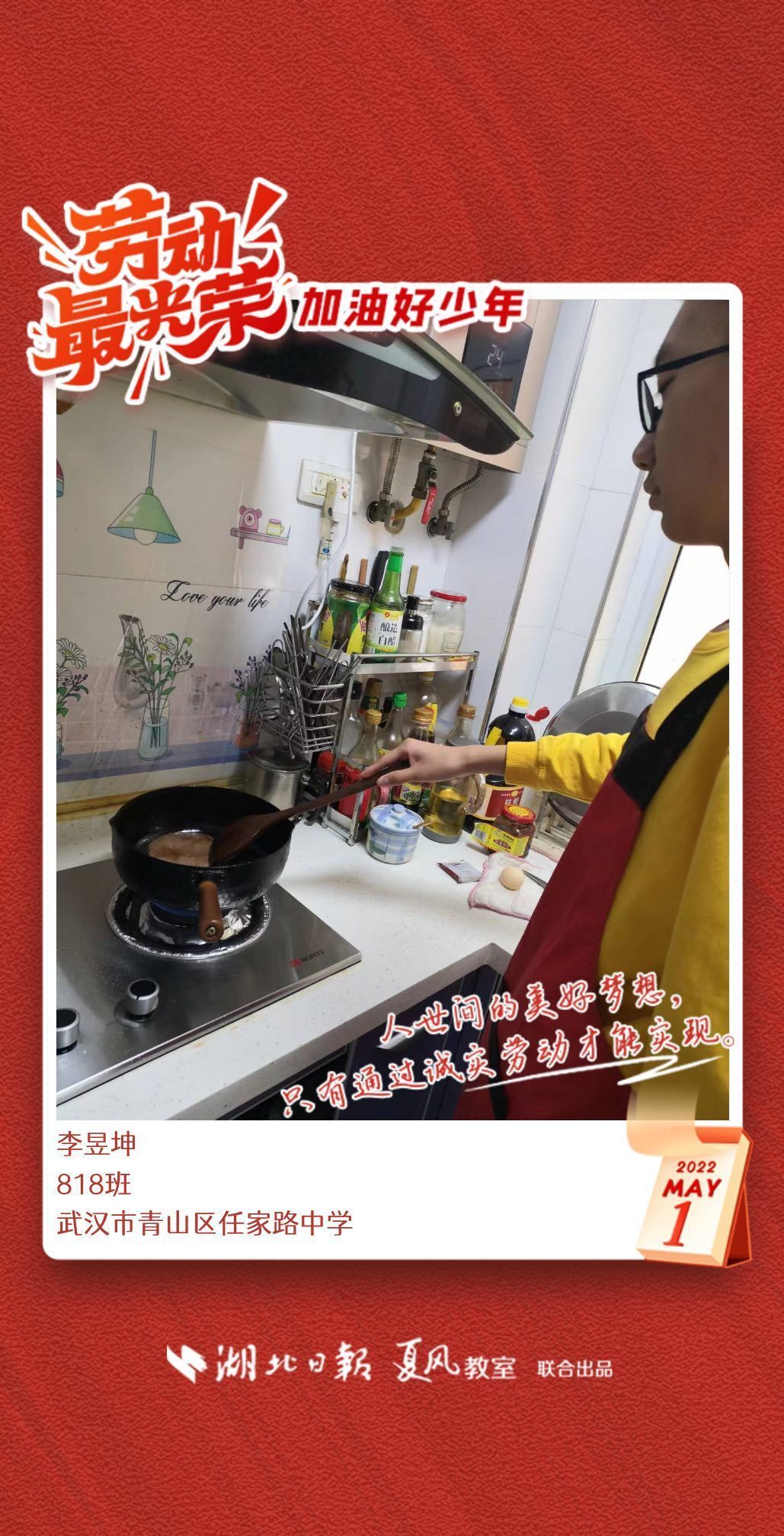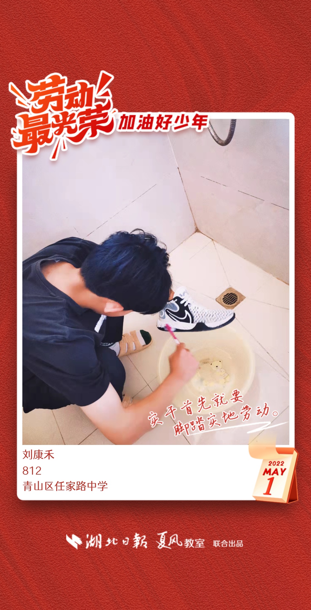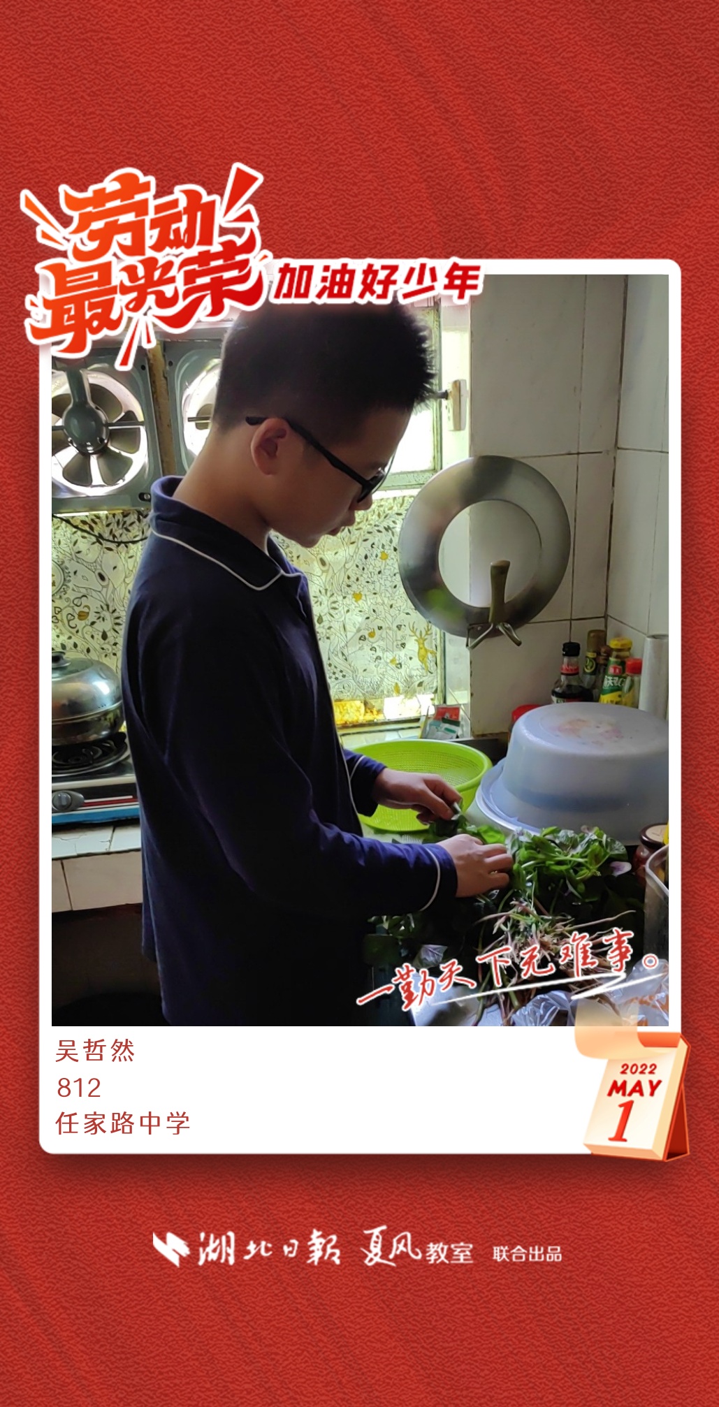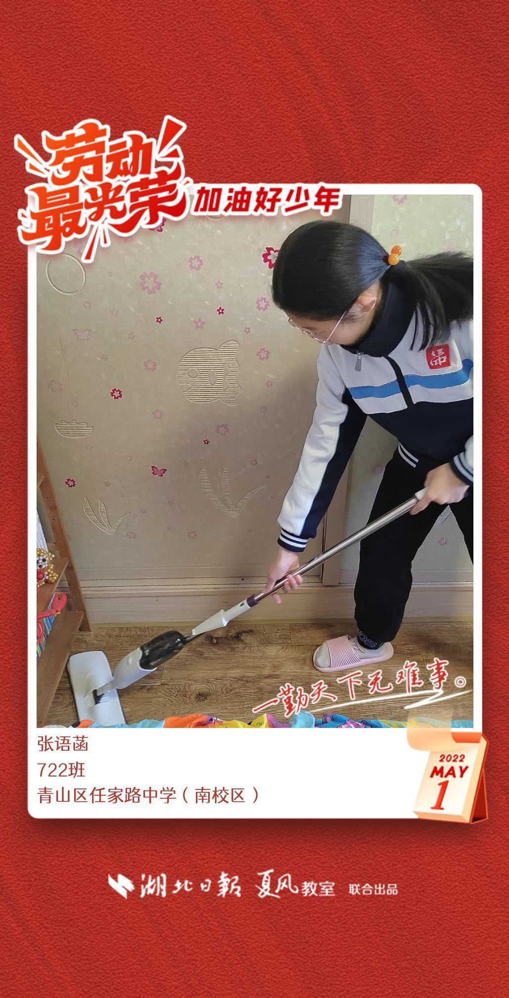 劳动是生活的基础,也是幸福的源泉。在“五一”劳动节来临之际,武汉市任家路中学号召学生自主选择一种劳动方式,完成“一份特别的劳动节作业”。