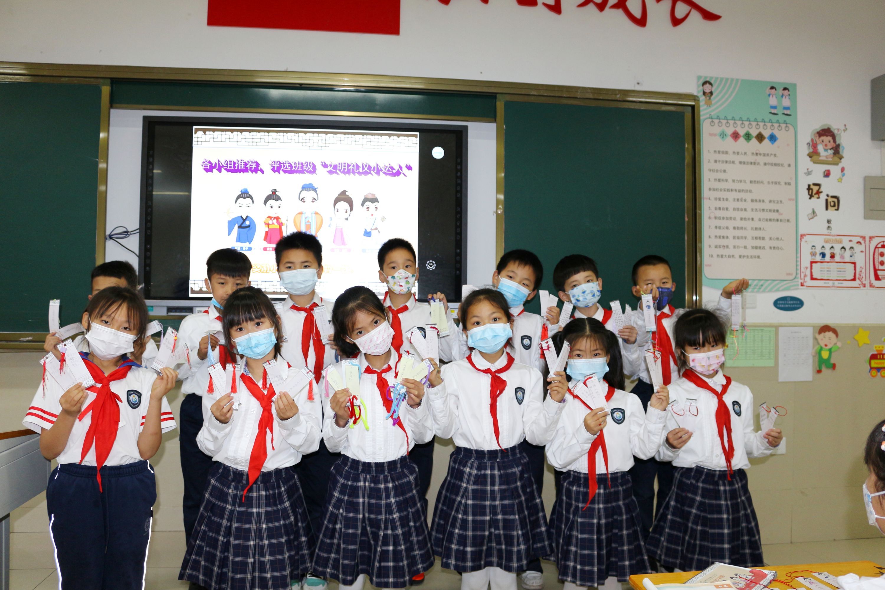 在“五一”假期前开展的一次“养礼仪·顺人生”文明礼仪公约评比中,同学们纷纷晒出自己亲手制作的书签,讨论践行“公约”内容的方式方法,或推荐班内的“文明礼仪小达人”,来获取小陶人贴纸和礼包。