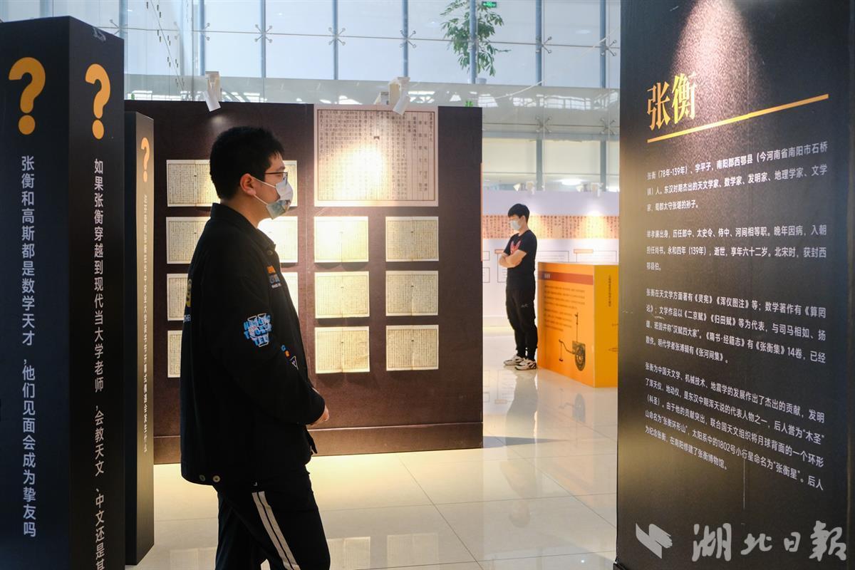 东侧展区中央有5个彩色立方体,介绍了张衡“浑天仪”“地动仪”“指南车”等发明创造,图文阐释了他在设计中的美学思想;丰富的文献史料,则突出展现了他在文学艺术上的成就。现场还陈列了华中农大图书馆藏清石印本《后汉书·张衡传》等古籍,及《张衡集》等馆藏图书,供读者借阅。