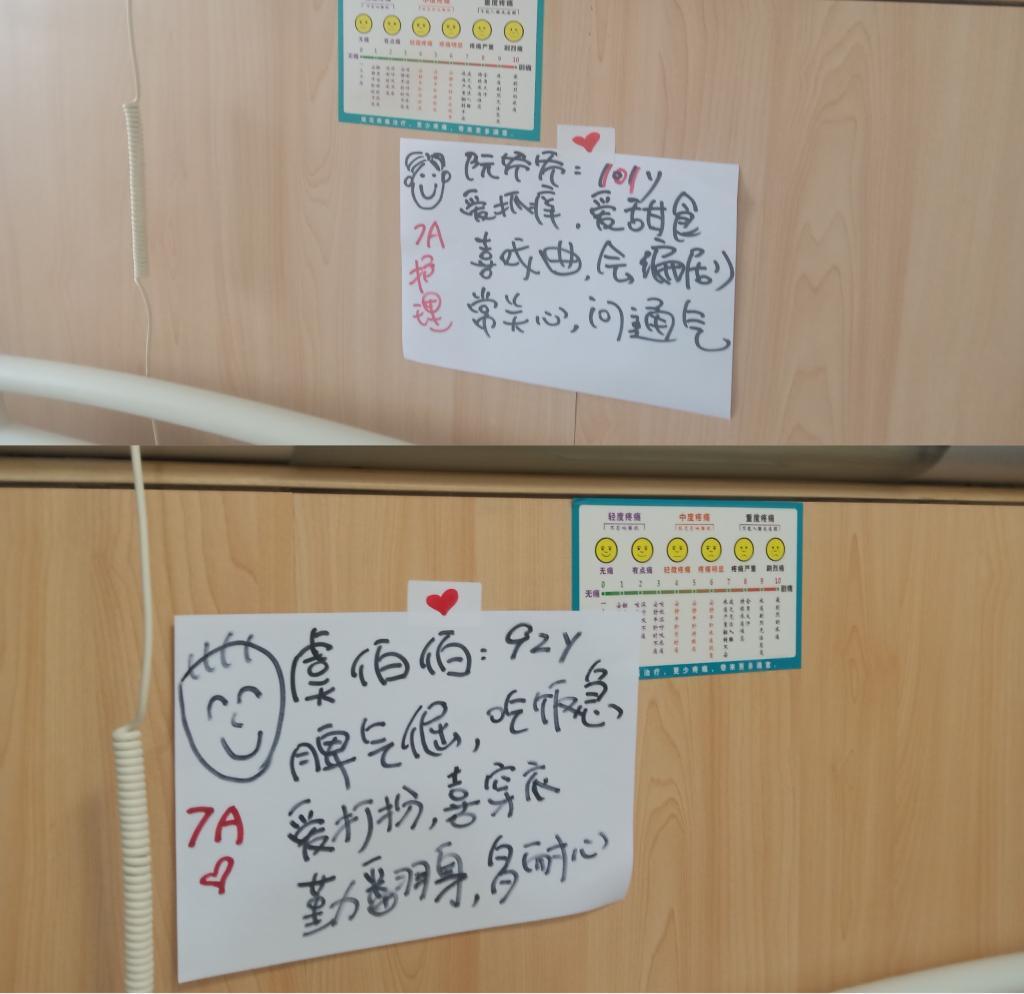 为了更好地展开救治,也有利于帮助老年患者尽快康复,护理部团队开动脑筋,从张俊颖的第一张“个性化床贴”后,大家集思广益,用幽默诙谐、直观突出的“小贴士”将患者性格特点及主要护理点概括其中。