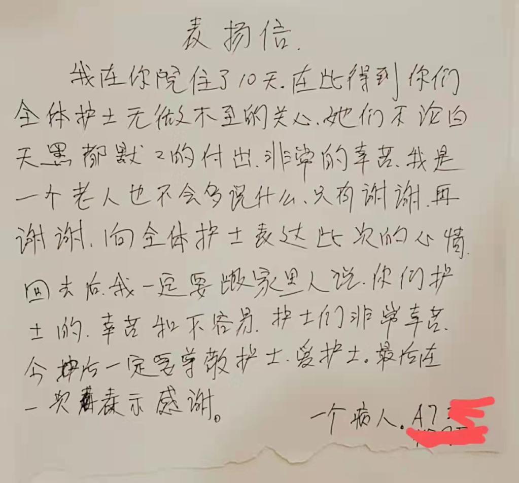 “我在你院住了10天,在此得到你们全体护士无微不至的关心。回去后我一定要跟家里人说,你们护士的辛苦和不容易。”一位患者在表扬信上这样写道,“我是一个老人,也不会多说什么,只有谢谢再谢谢……”