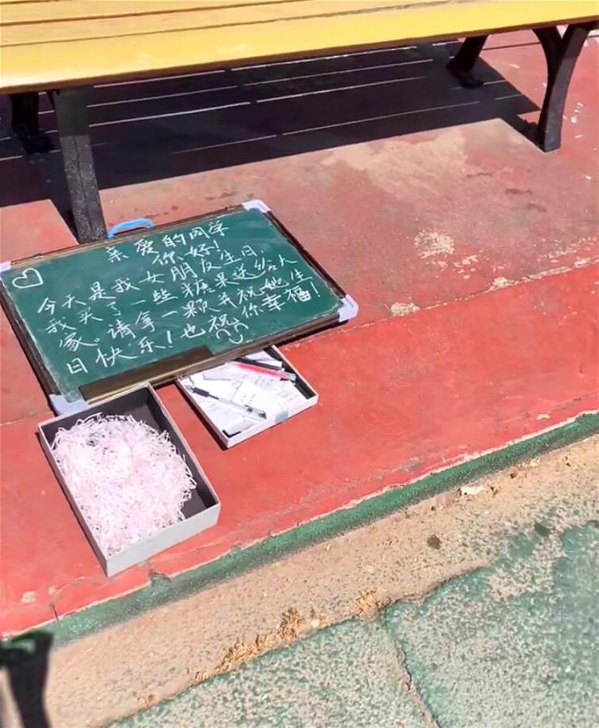 据网友发布在社交平台的视频显示,一块小黑板摆放在红色的地面上,旁边还有两个盒子,里面放着纸絮以及便签、笔。这块黑板写着这样一段话:“亲爱的同学,你好!今天是我女朋友生日,我买了一些糖果送给大家。请拿一颗并祝她生日快乐!也祝你幸福!”该网页的视频配文写道:“原来看到别人幸福也会掉眼泪!”