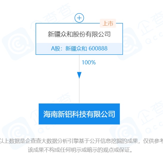 海财经·证券导报5月6日讯(记者 梁天琪)4月29日,海南新铝科技有限公司(下称:海南新铝)成立,股权穿透图显示,该公司由新疆众和(600888.SH)全资控股。