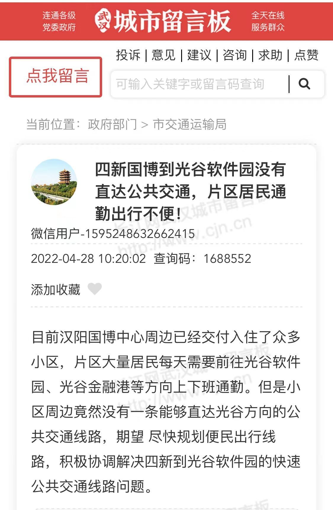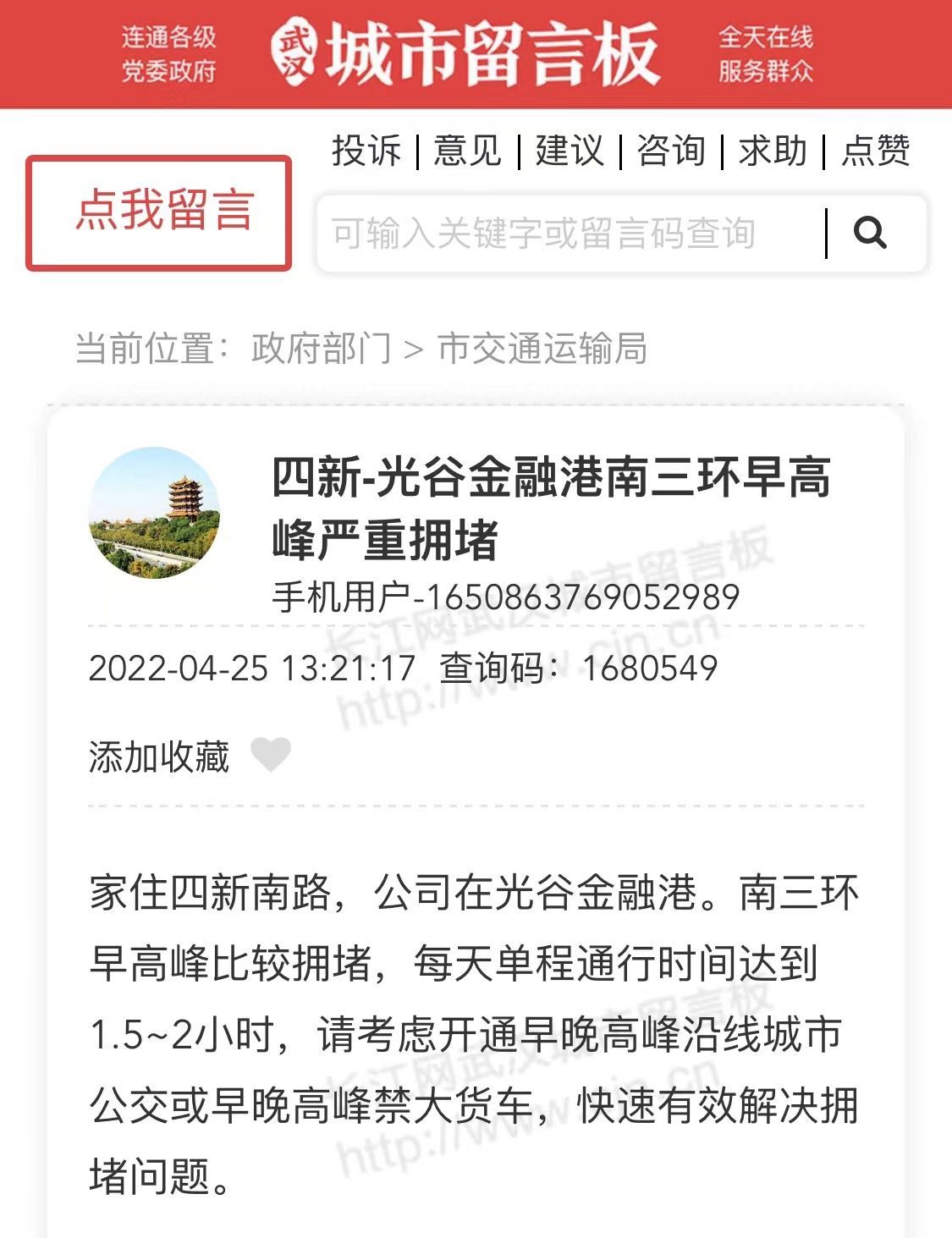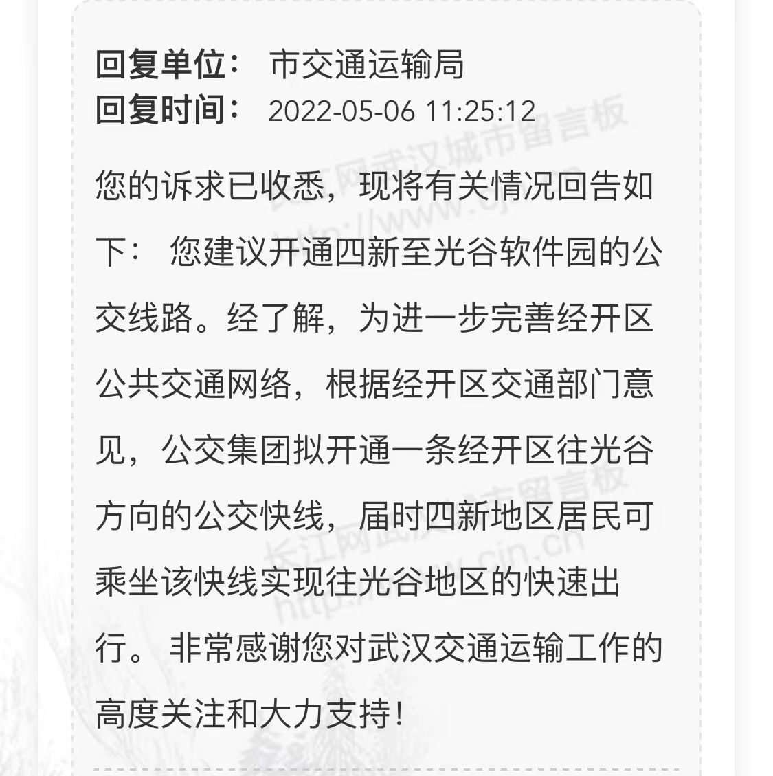 另一位网友也在武汉城市留言板上反映同样的诉求。这位网友表示,自己住在四新南路,在光谷金融港上班。南三环早高峰比较拥堵,每天单程通行时间都是1.5小时到2个小时之间,期望能开通到光谷的环线公交,方便居民出行。