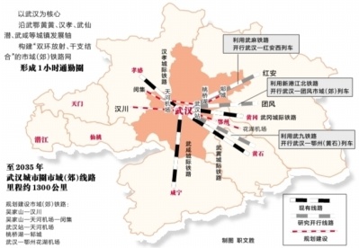 武汉城市圈统筹既有铁路资源利用及新建,以武汉为核心,沿武鄂黄黄、汉孝、武仙潜、武咸等城镇发展轴构建“双环放射、干支结合”的市域(郊)铁路网,多点多向、高效衔接武汉市综合交通枢纽及城轨线网,形成1小时通勤圈。至2035年,武汉城市圈市域(郊)线路里程约1300公里。
