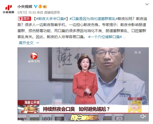 【熬夜太多会口臭】熬夜加班?熬夜追剧?很多人一边熬夜刷着手机,一边担心熬夜伤身。专家提示:熬夜会影响肠道菌群、损伤肠胃功能,而口臭的很多原因与消化不良、肠道菌群紊乱、口腔菌群紊乱有关。因此,熬夜的人非常容易口臭。