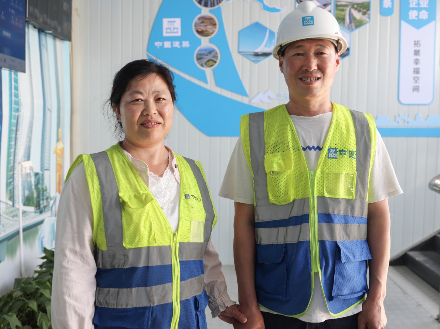 十路一桥项目建设者夫妻电工黄保祥(右)、后勤人员周世霞微笑宣言:“为了我们的美好生活努力奋斗,加油!”
