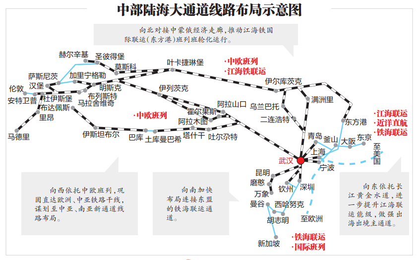 具体为,向东依托长江黄金水道,进一步提升江海联运能级,做强出海出境主通道;向西依托中欧班列,巩固直达欧洲、中亚铁路干线,谋划至中亚、南亚新通道线路布局;向南加快布局连接东盟的铁海联运通道;向北对接中蒙俄经济走廊,推动江海铁国际联运(东方港)班列班轮化运行。