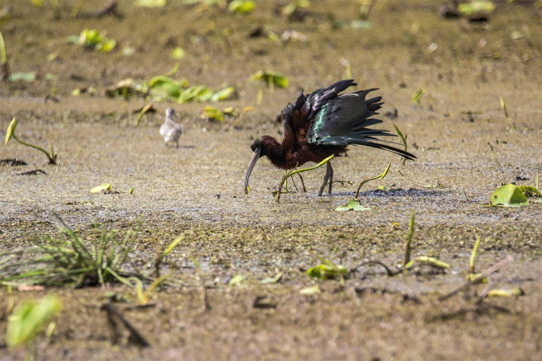 这次和2020年4月在晋宁南滇池国家湿地公园发现的一样都是以孤鸟出现,没有聚群活动。这只彩鹮跟黑翅长脚鹬、弯嘴鹬、小滨鹬、中小白鹭、牛背鹭及其它鸟类一起觅食翻找食物和休息。