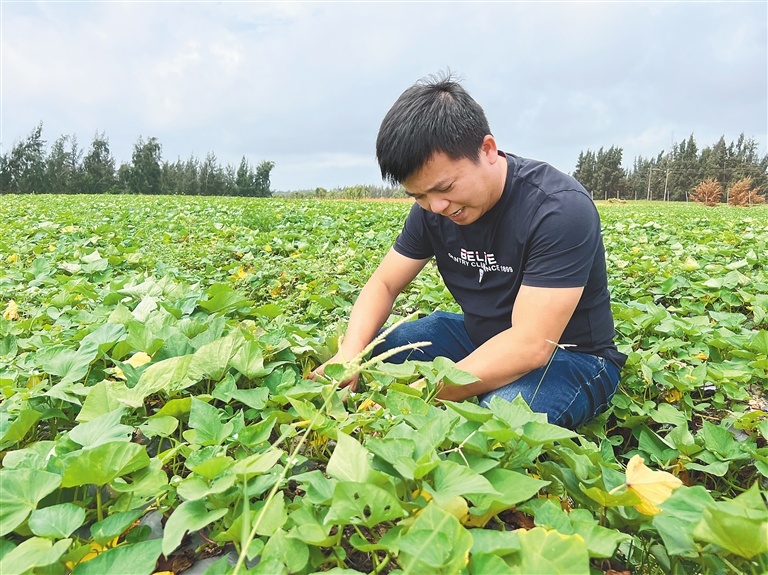 5月9日,在文昌市铺前镇林梧村木兰湾板栗地瓜种植基地,文昌木兰湾生态农业科技有限公司法人代表韩伟在查看地瓜长势。海南日报记者 苏庆明 摄