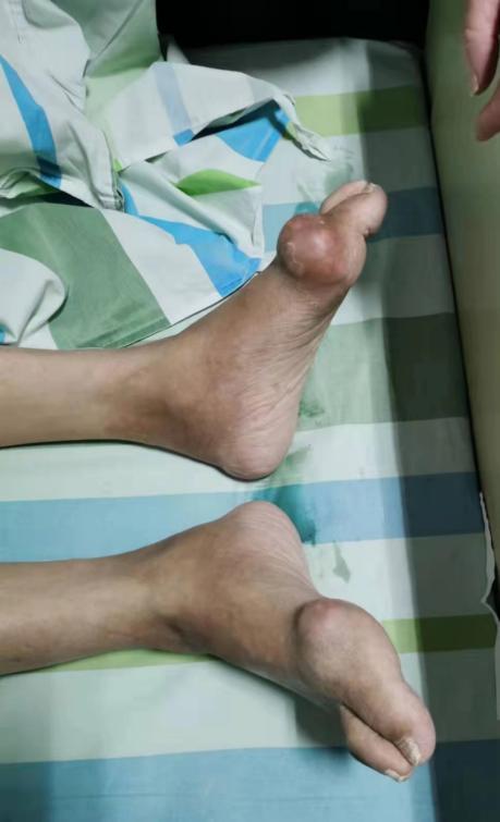 63岁的胡先生患痛风性关节炎多年,但是爱吃的他根本管不住嘴,导致关节处长了不少大大小小的痛风石。前段时间,其痛风性关节炎又发作了,双足隆起如生姜般大小的痛风石,又肿又疼,连鞋子也穿不进去,只能一直卧床,于是家人将其抬到了湖北省第三人民医院中西医结合肾病科(风湿免疫科)。