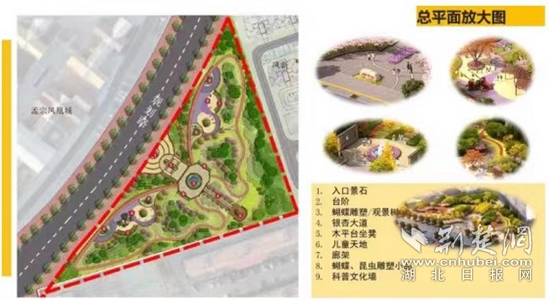 按照因地制宜的原则,凤凰城口袋公园位于凤凰城市场对面,占地面积约为10000平方米,结合地理位置和人文特色,以蝴蝶展翅为公园建设主题,展现一园一特色的景观效果,建设内容包括乔木、色块、草坪种植、园林小品以及公厕等。