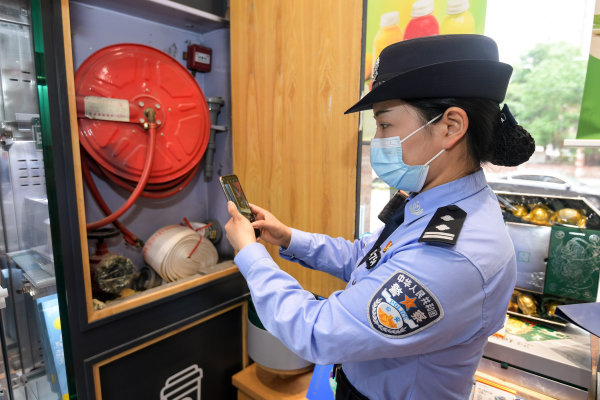 华丽(中)在辖区内的网吧检查制度落实情况。