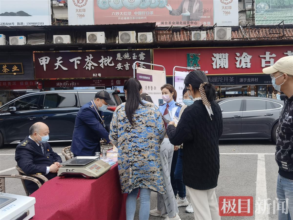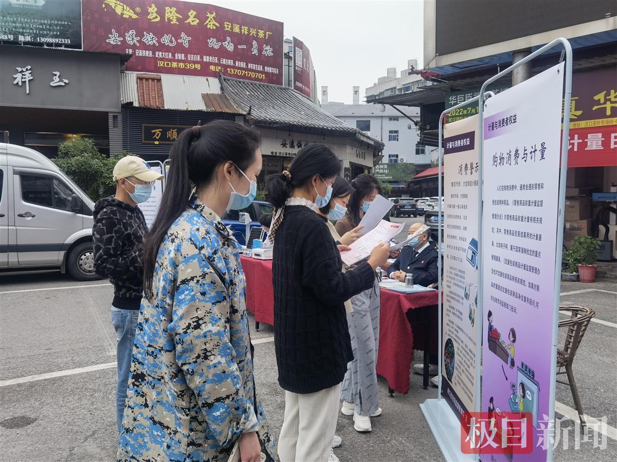 当天下午,汉口茶市的中央广场上,宣传展板一一排列,前来观看的人中,有不少消费者,也有很多市场内的茶商。市民刘先生告诉记者,以往,他在买菜的时候一旦发现秤不准,都会跟老板扯半天,“现在我知道了,可以直接向市场监管部门举报。”