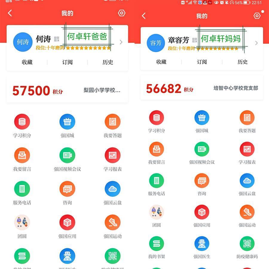 813班学生何卓轩的爸爸、妈妈“学习强国”总得分均在56000分以上。“一天的工作学习,由‘百灵’之音开启;在车上时,时事播报声耳旁萦绕;家庭‘对战’,紧张又不失和谐,家庭素养日益提升!”