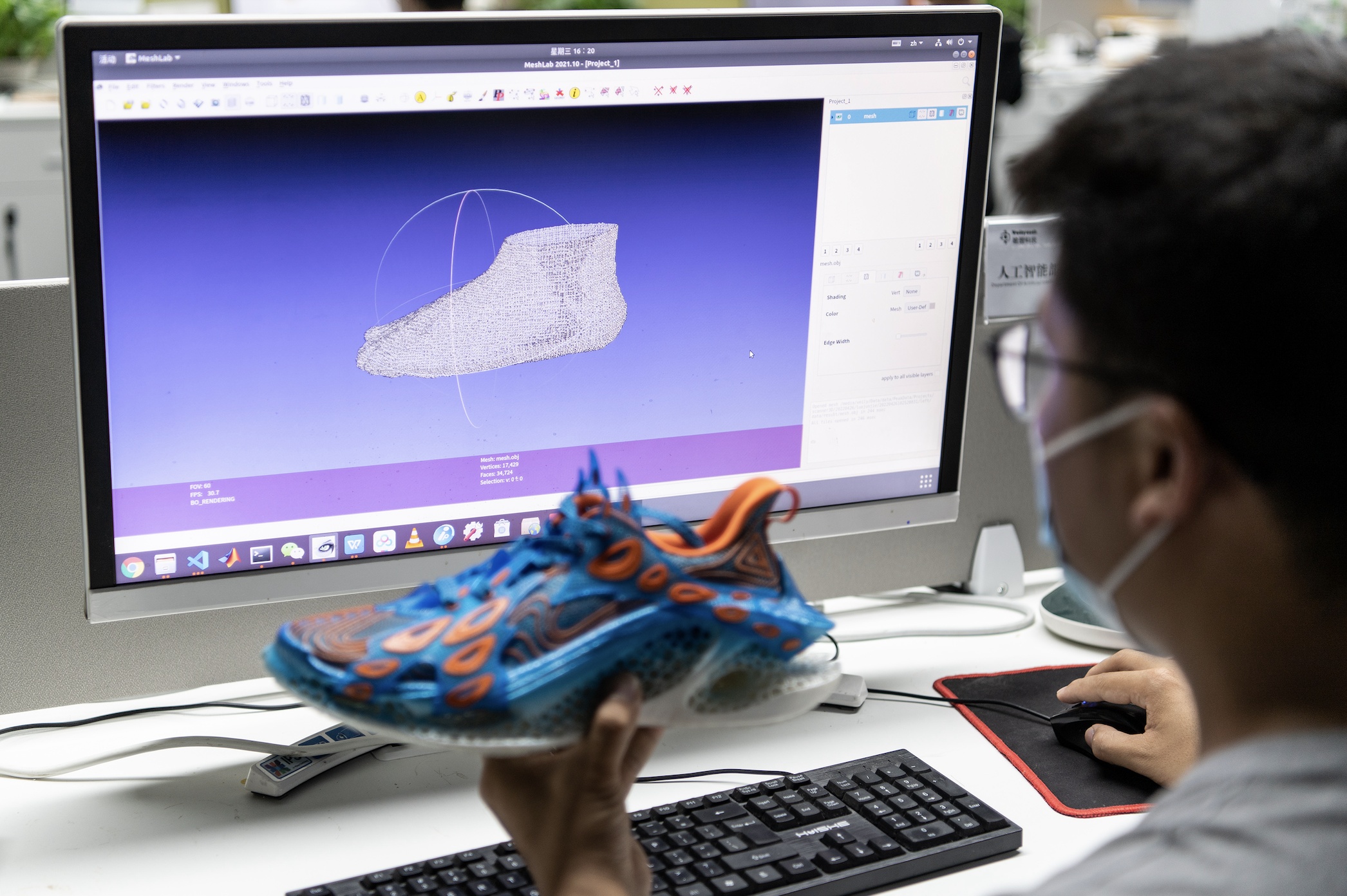 湖北青创园(光谷)示范园今年2月开园以来,已吸引46家小微科创企业入驻,为企业免去水电、带宽等费用,为创业青年提供低成本入孵,更好服务留鄂青年创业就业。图为位于该园的武汉唯理科技有限公司人工智能工程师罗俊杰对三维重建后的脚部模型进行分析。记者任勇 摄