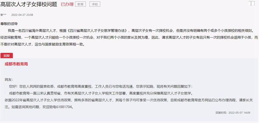 收到留言后,成都市教育局高度重视,安排工作人员与留言网友进行了电话沟通,并同时回复表示:该局一直以来认真贯彻省、市有关高层次人才子女入学相关工作部署,高度重视并充分保障高层次人才子女就学。依据2022年省高层次人才子女入学优待政策,拥有多孩的省高层次人才,其每个孩子均可享受一次优待政策。