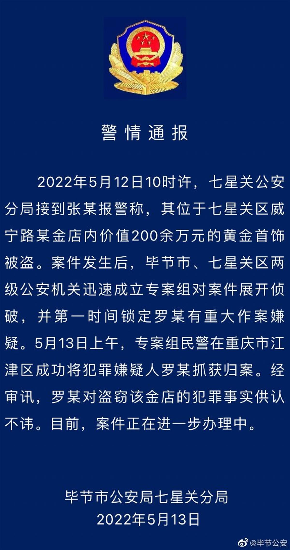 毕节市公安局七星关分局此前发布警情通报称,5月12日10时许,七星关公安分局接到张某报警称,其位于七星关区威宁路某金店内价值200余万元的黄金首饰被盗。案件发生后,毕节市、七星关区两级公安机关迅速成立专案组对案件展开侦破,并第一时间锁定罗某有重大作案嫌疑。5月13日上午,专案组民警在重庆市江津区成功将犯罪嫌疑人罗某抓获归案。经审讯,罗某对盗窃该金店的犯罪事实供认不讳。目前,案件正在进一步办理中。