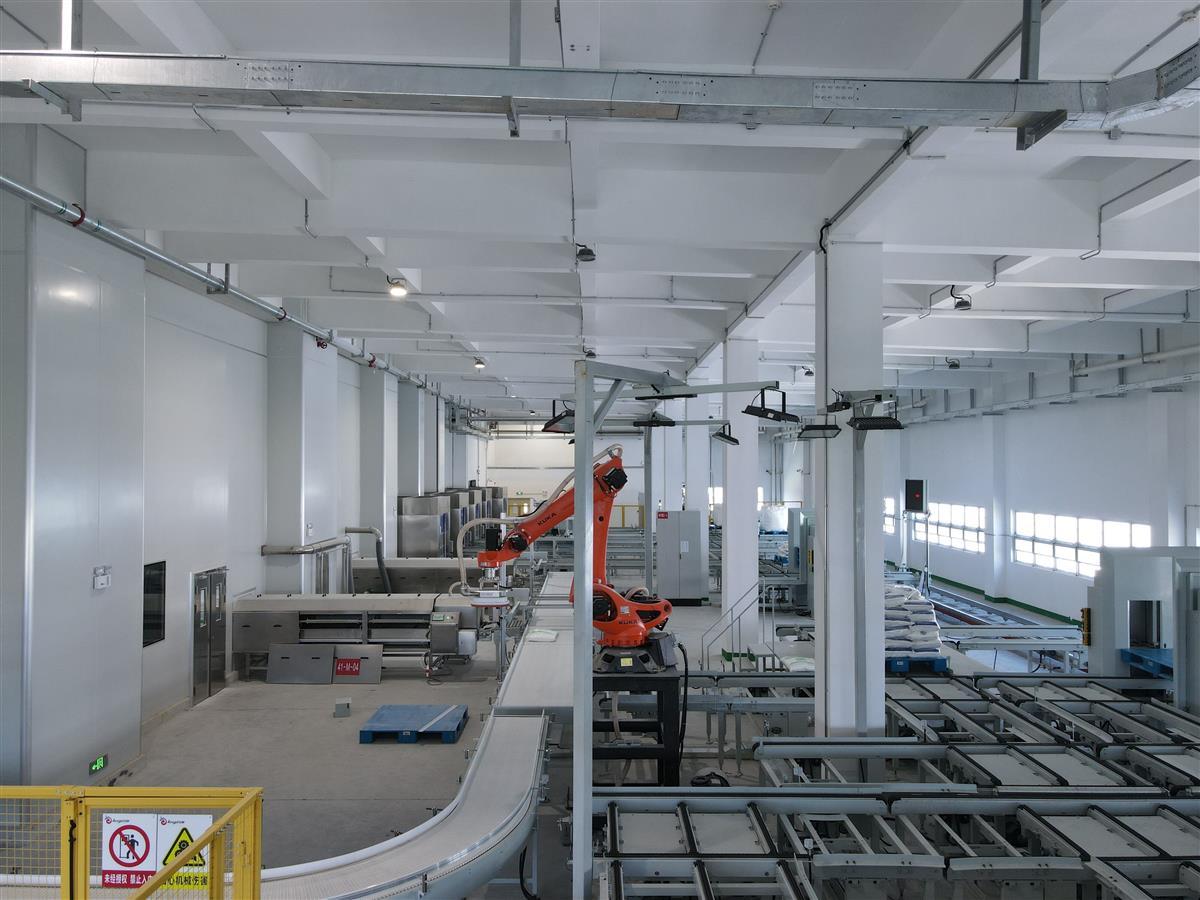 这是一间净空20多米的立体仓库,里面布满滑轨和传送带,空中还有机械臂和吊钩。机器嗡嗡运行,传感器的灯光来回闪烁,偶有大包的食品原料从传送带上经过,都像自己认得路一般,直奔要去的货位;有些则被机械臂和吊钩一把抓过去,投入到设定的料口。