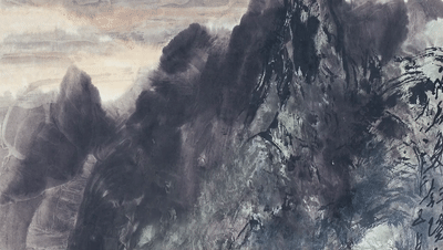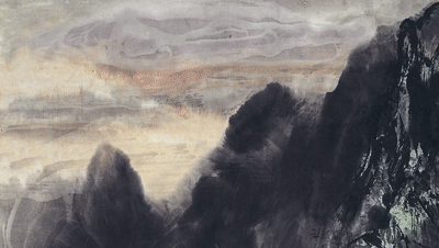 顶天立地的山体占据了画面的主要部分,给人以强烈的视觉冲击力。大山以丰富的墨色渲染铺陈,从画面右下侧到左上侧,墨色由淡入浓,拉开了近景、中景与远景。