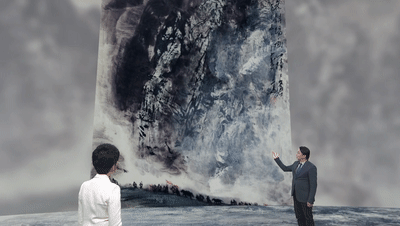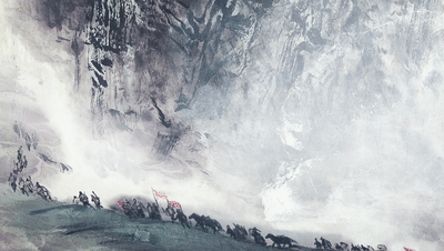 巨大块面的山峦与连点成线的队伍,在比例上形成了强烈的反差。庞大山体的压迫感进一步加剧,冷峻的自然环境和残酷的战争氛围迎面袭来。