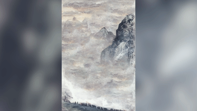 自山峰而下,画家飞扬挥洒的墨笔,留下了轻重相间、虚实交错的皴擦墨痕,杂而不乱。