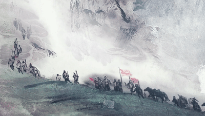 战士们身体倾斜、奋力向前的姿态,让人自然地联想到山谷中的猎猎寒风和坎坷道路。几面红旗在队伍中飘扬,象征着战士们顽强与坚毅的革命信心,更令人备受鼓舞。