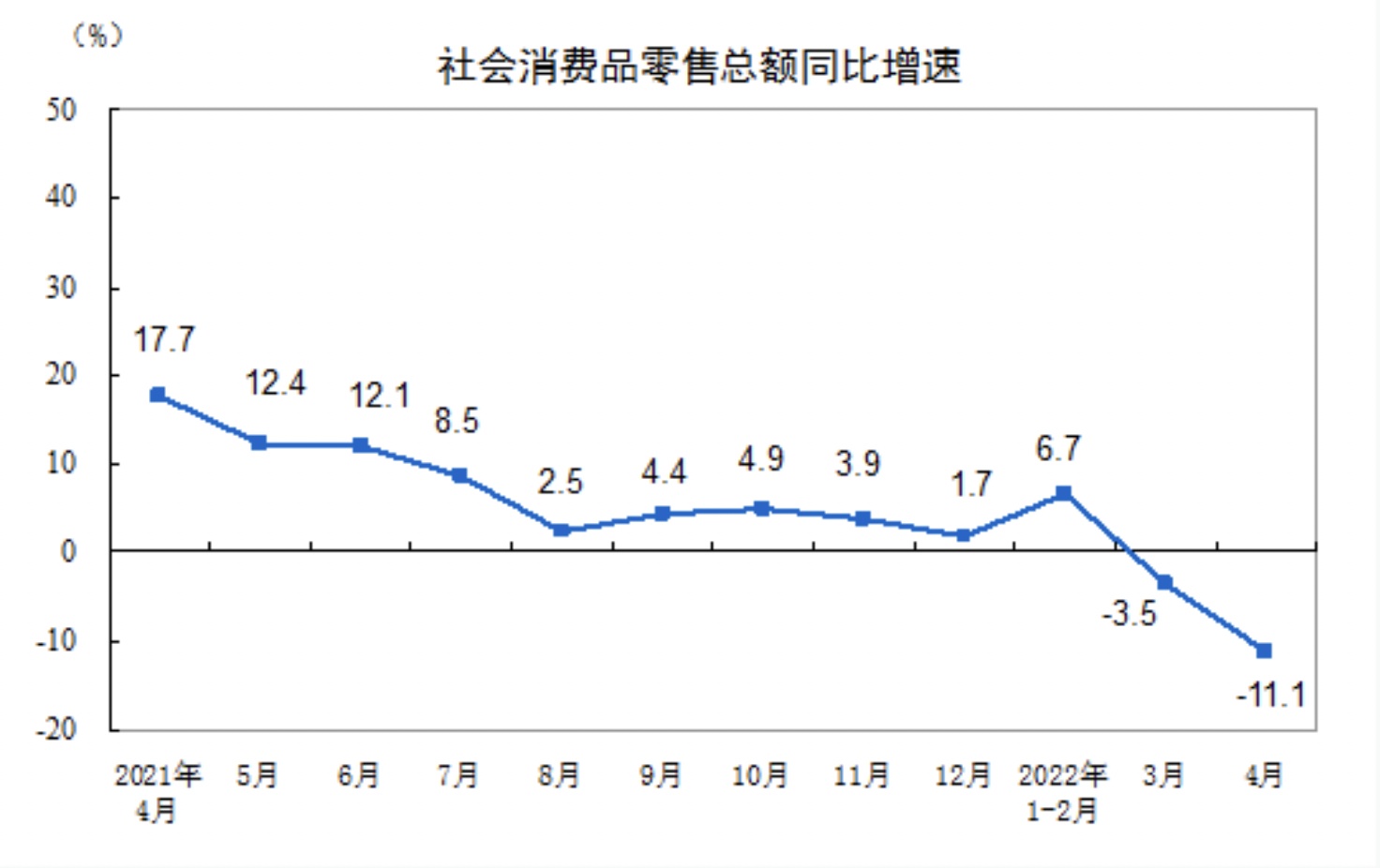 国家统计局16日发布的数据显示,4月份,规模以上工业增加值增速同比下降2.9%,服务业生产指数下降6.1%,社会消费品零售总额下降11.1%。全国城镇调查失业率为6.1%,比上月上升0.3个百分点。