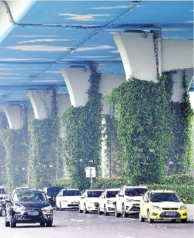 武汉经开区东风大道高架桥的桥墩,在爬山虎的装饰下,变成了一排整齐挺拔的绿柱。
