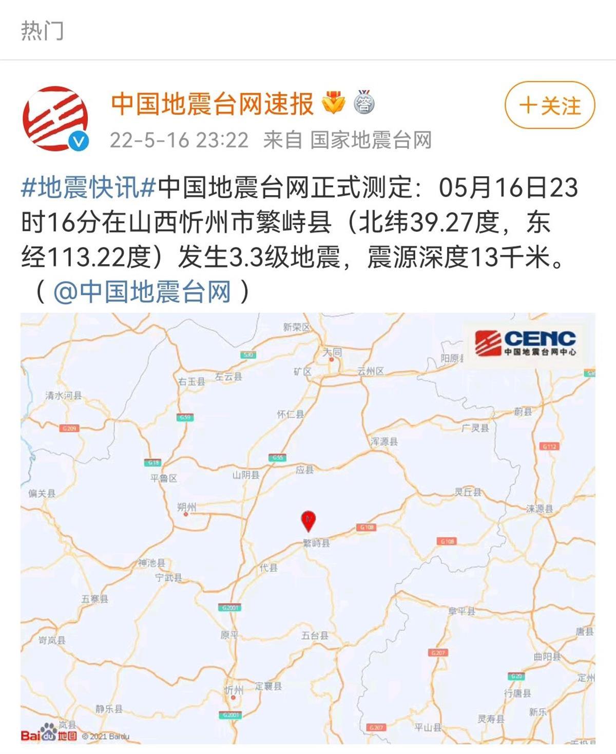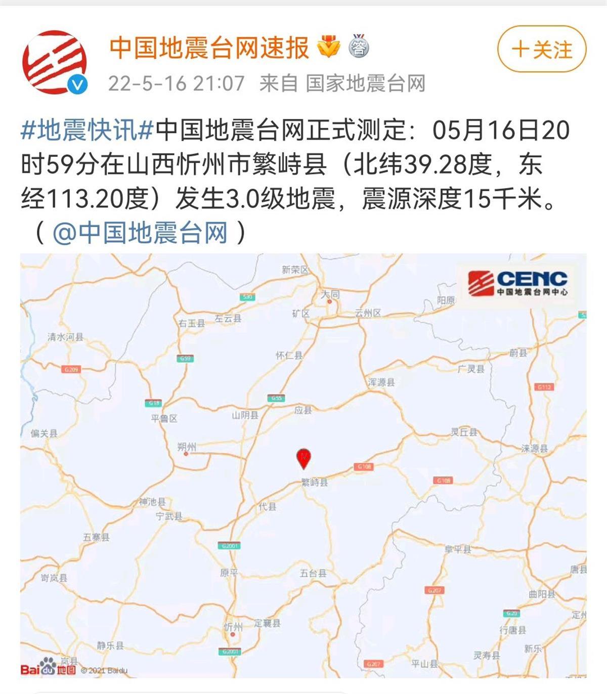 据中国地震台网速报官方微博消息称,5月16日20时59分在山西忻州市繁峙县发生3.0级地震,震源深度15千米。同一天23时16分,繁峙县发生3.3级地震,震源深度13千米。