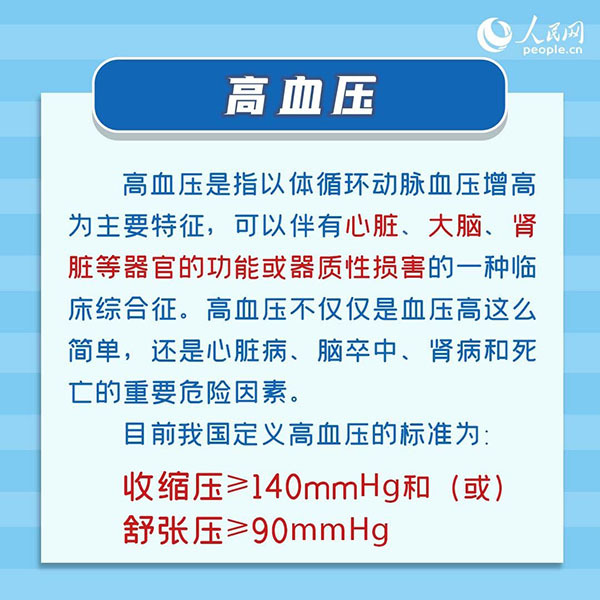 “高血压是指以体循环动脉血压增高为主要特征,可以伴有心脏、大脑、肾脏等器官的功能或器质性损害的一种临床综合征。”首都医科大学附属北京友谊医院心血管中心黄榕翀教授在接受人民网记者采访时介绍,目前我国定义高血压的标准为,收缩压≥140mmHg和(或)舒张压≥90mmHg。