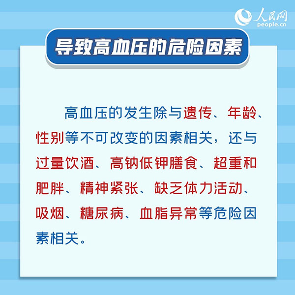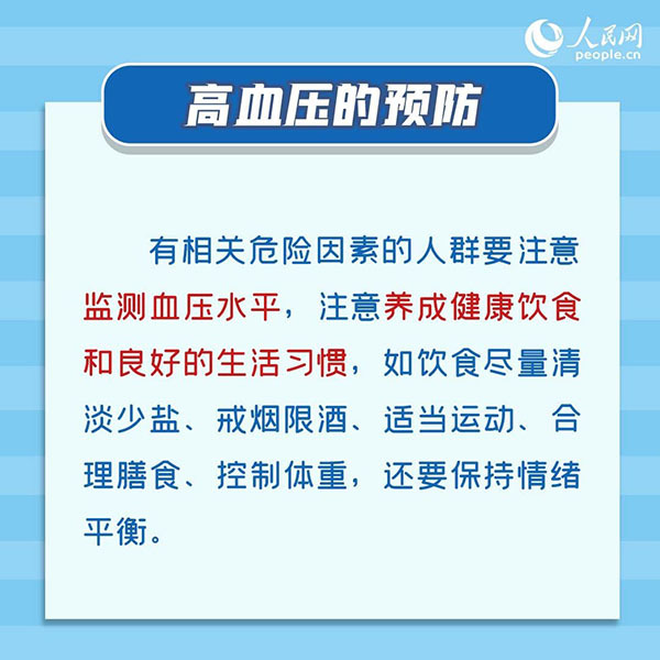 “研究发现,高血压的发生除与遗传、年龄、性别等不可改变的因素相关,还与过量饮酒、高钠低钾膳食、超重和肥胖、精神紧张、缺乏体力活动、吸烟、糖尿病、血脂异常等危险因素相关。”黄榕翀教授建议,有上述相关危险因素的人群要注意监测血压水平,注意养成健康饮食和良好的生活习惯,如饮食尽量清淡少盐、戒烟限酒、适当运动、合理膳食、控制体重,还要保持情绪平衡。