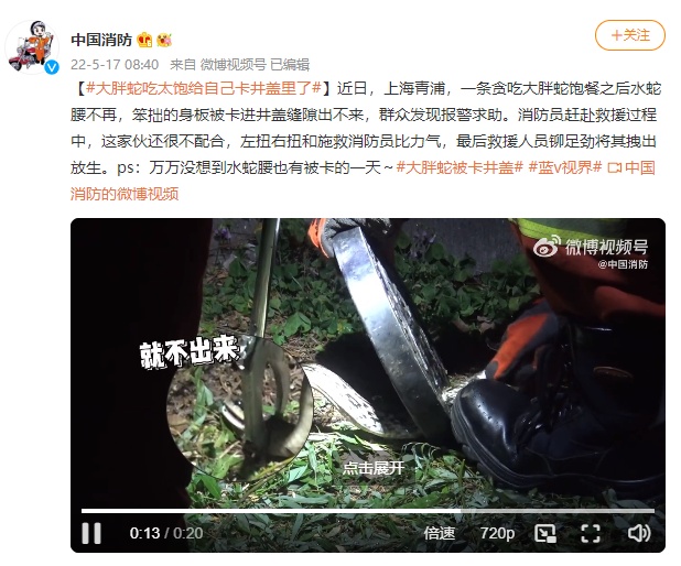 近日,上海青浦,一条贪吃大胖蛇饱餐之后水蛇腰不再,笨拙的身板被卡进井盖缝隙出不来,群众发现报警求助。消防员赶赴救援过程中,这家伙还很不配合,左扭右扭和施救消防员比力气,最后救援人员铆足劲将其拽出放生。ps:万万没想到水蛇腰也有被卡的一天。