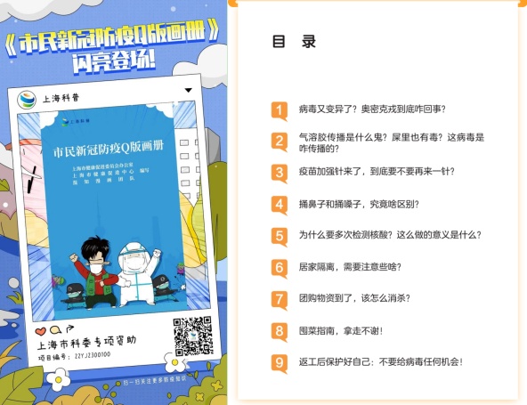 近日,上海《市民新冠防疫Q版画册》上线。该漫画手册精选市民最关注的病毒传播、核酸检测、居家隔离、快递消毒、返工防护等热点问题,形成9个主题的防疫科普漫画系列。