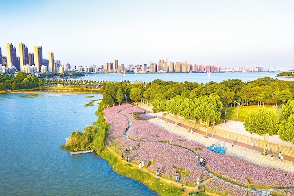 5月16日,武汉市洪山区南湖幸福湾公园的波斯菊进入盛花期,市民穿梭在花海中,绿头鸭、夜鹭等野生鸟类游水嬉戏,人与自然和谐共处。