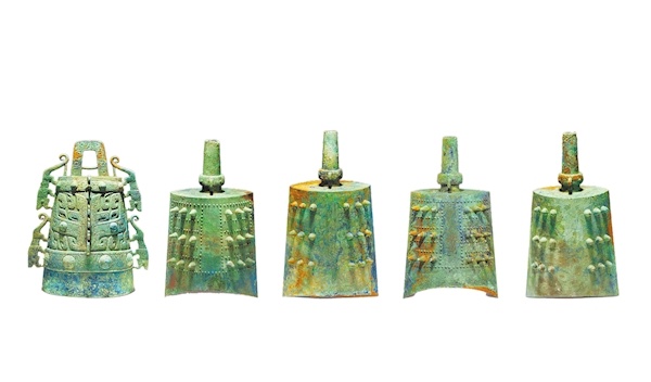 由一件镈钟和四件甬钟组成,其中两件甬钟上的小鸟纹标志侧鼓音得到应用。这套编钟从低音徵(sol)开始的四声音列,是“五正声”(宫、商、角、徵、羽)的源头。