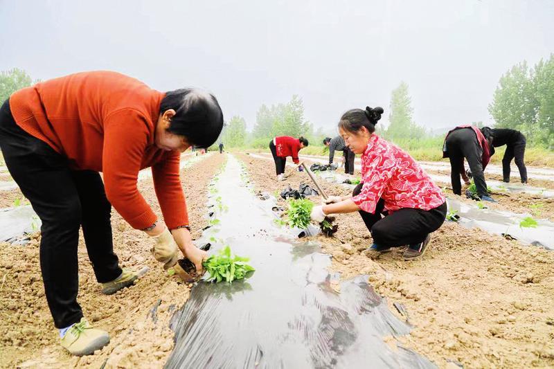 随县高城镇嵩垛村、龙王庙村、雷家祠村、七里塔村等11个村今年种植线椒近500亩。据了解,该品种线椒亩产5000-7000斤,村集体与绿康源合作社签订合同,合作社提供辣椒苗、专用化肥等,鲜椒保底价回收。图为5月15日,村民正在栽辣椒苗。 (随州日报全媒记者李文军、通讯员张玉国摄)