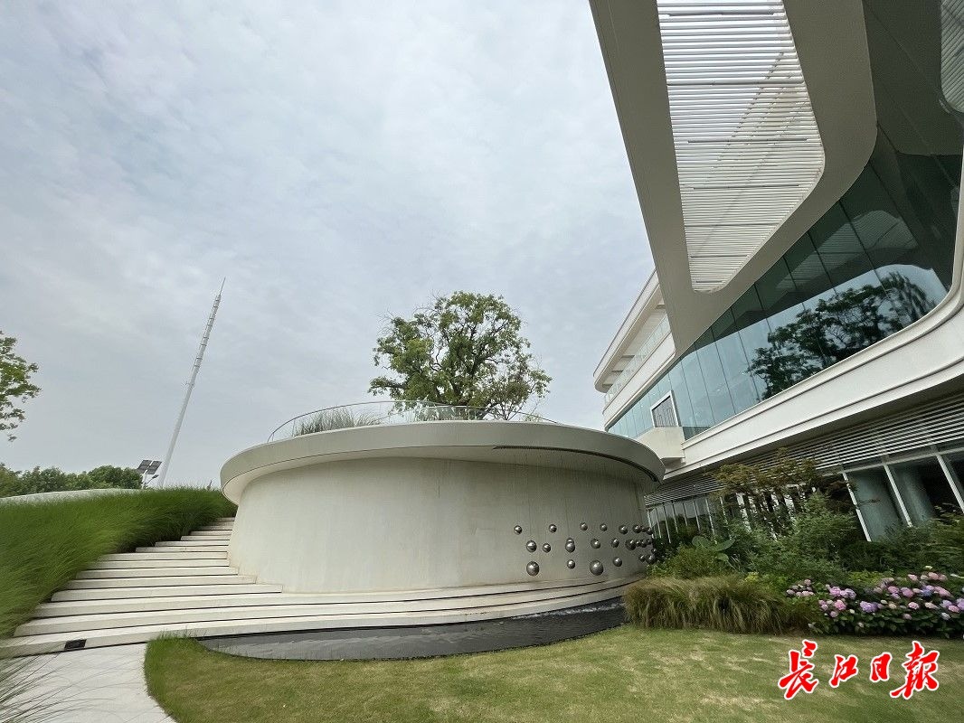 记者沿着环形坡道进入平台,坡道出口“鹅社书店”的招牌映入眼帘,平台二层滴下的水流汇集到书店门前的景观池中,水流声、风铃声浑然天成。沿着二层斜坡继续前行,坡道两旁的狼尾草随风摇曳,与纯白的墙面交相辉映。
