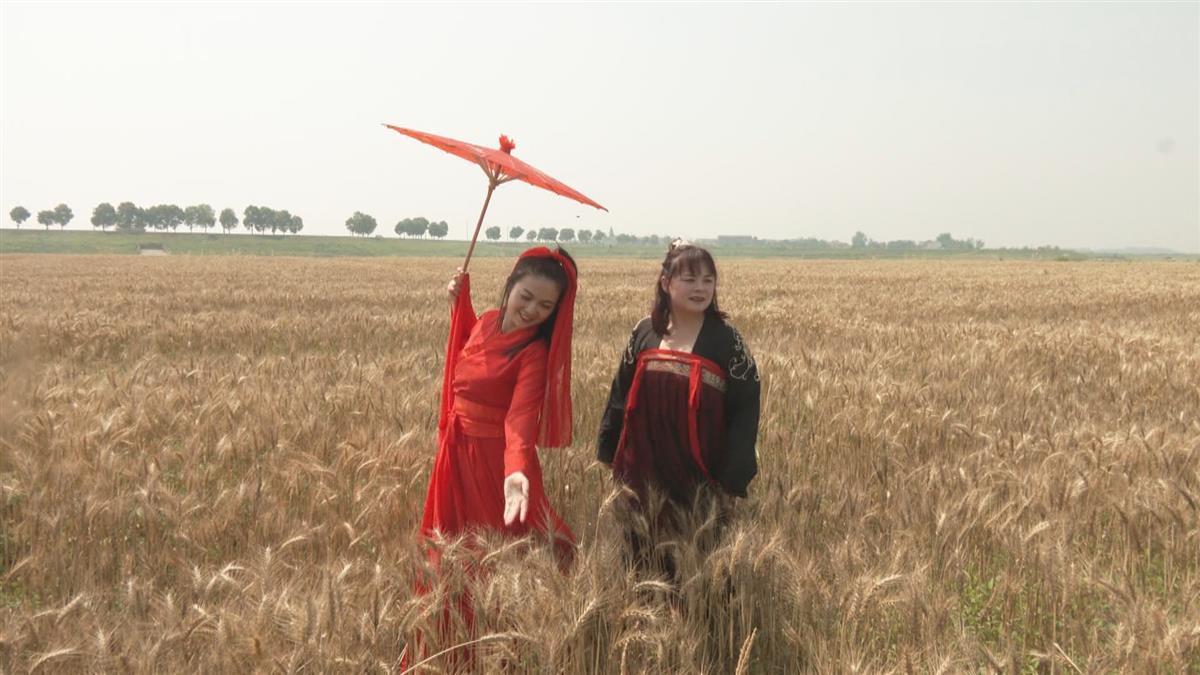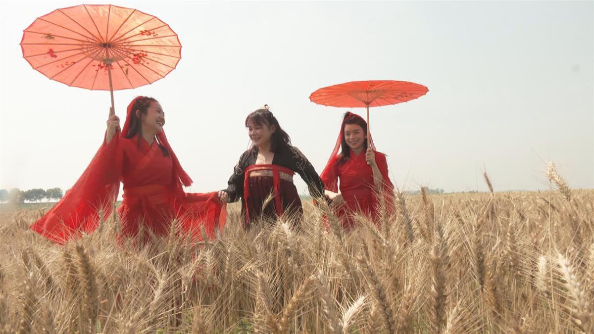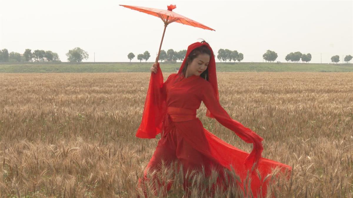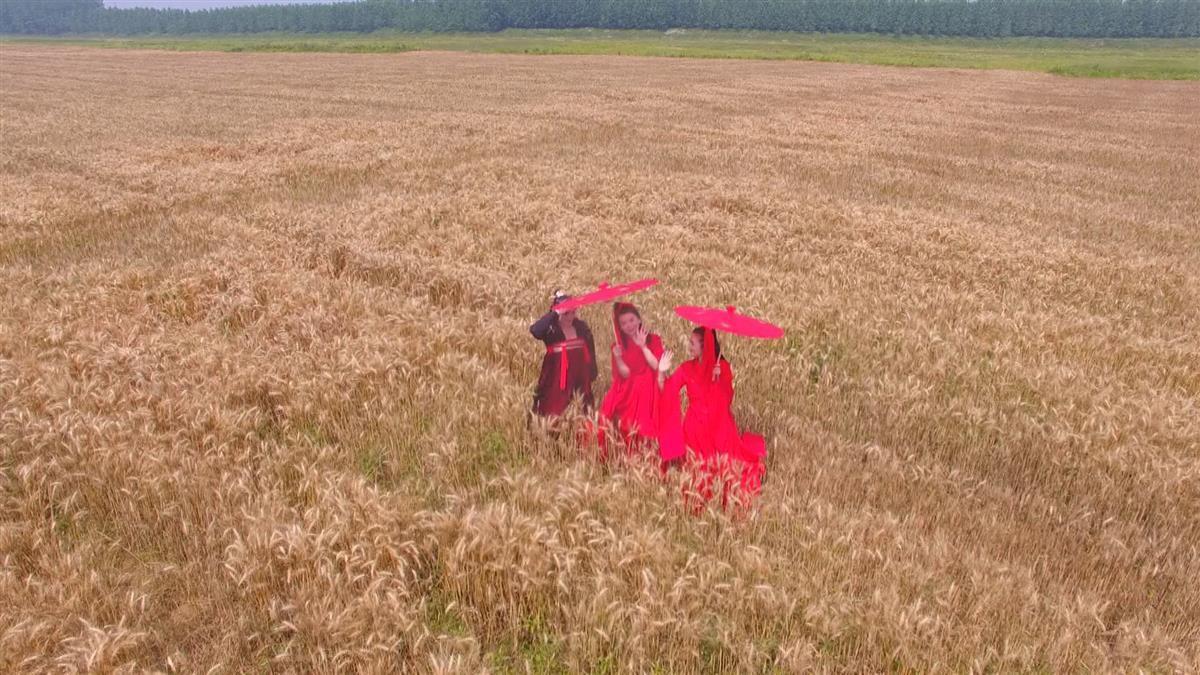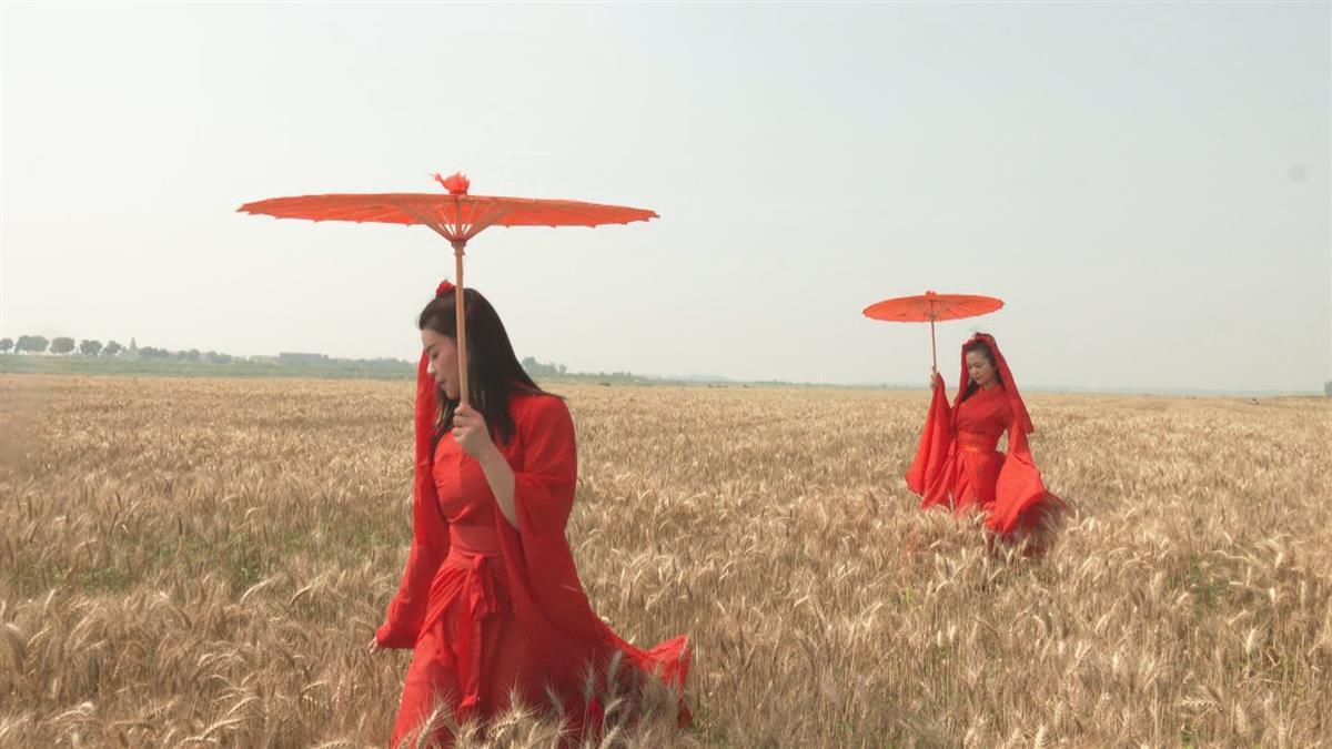踏足小路,伫立于田间,看着那金黄的麦田,微风拂过,一波波麦浪随风滚滚涌动,像滚着一堆又一堆的碎金子,初夏的阳光似锡箔儿般在麦尖跳跃。一颗颗色泽金黄的麦粒透着悠悠的香味,散逸在空中,发酵成独特的五月气息。眺望远处,几名妙龄女子身着大红色的汉服撑着纸伞在田间翩翩起舞,优雅的舞姿、飘动的裙摆、腼腆的微笑,仿佛让人搭乘时光机穿越到古代。