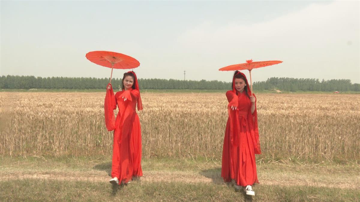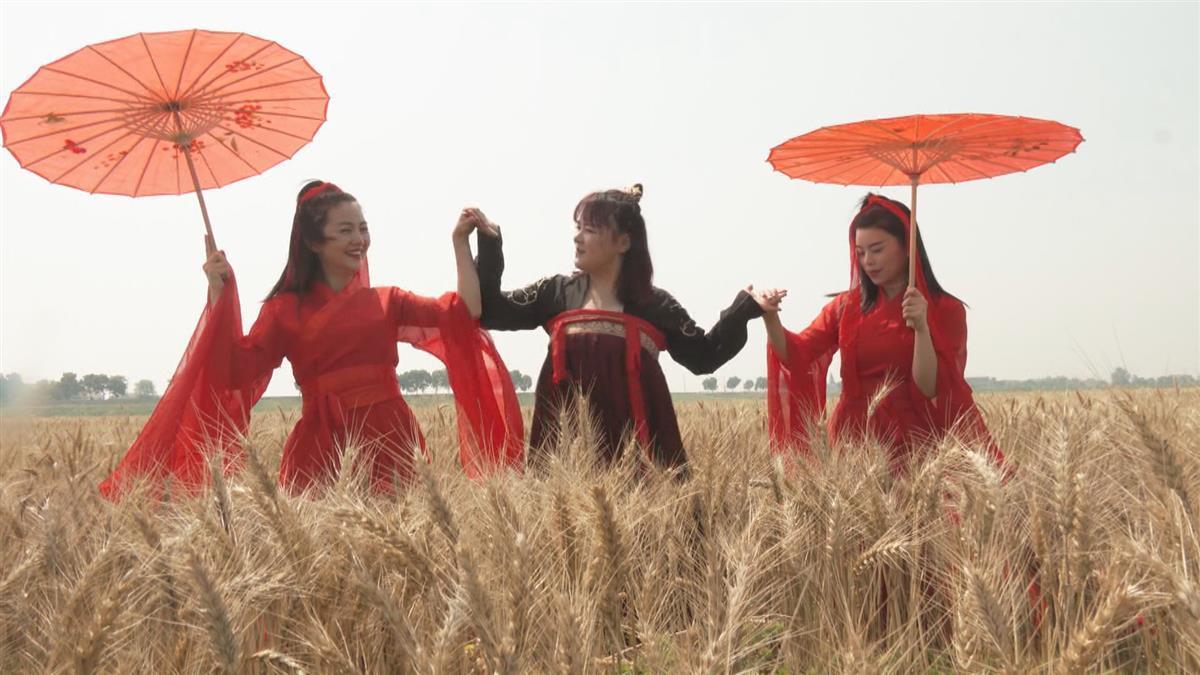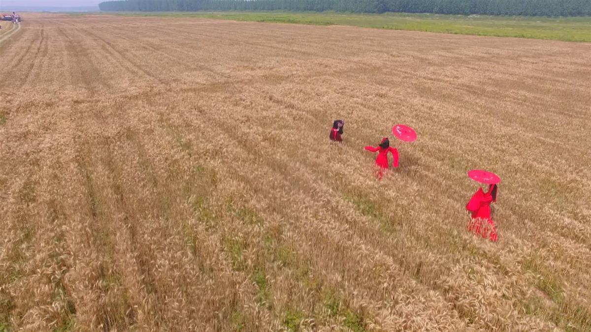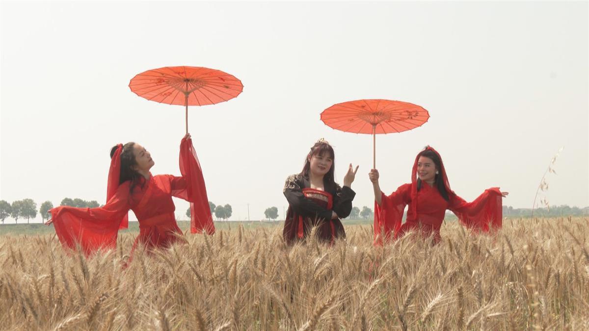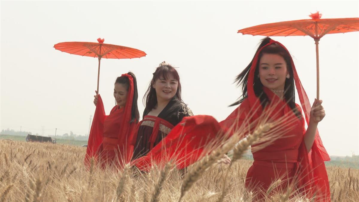 踏足小路,伫立于田间,看着那金黄的麦田,微风拂过,一波波麦浪随风滚滚涌动,像滚着一堆又一堆的碎金子,初夏的阳光似锡箔儿般在麦尖跳跃。一颗颗色泽金黄的麦粒透着悠悠的香味,散逸在空中,发酵成独特的五月气息。眺望远处,几名妙龄女子身着大红色的汉服撑着纸伞在田间翩翩起舞,优雅的舞姿、飘动的裙摆、腼腆的微笑,仿佛让人搭乘时光机穿越到古代。