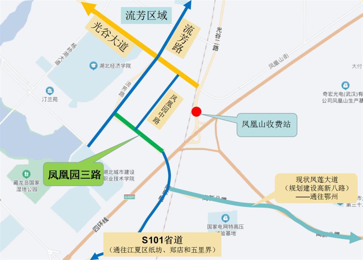 光谷交通公司有关项目负责人表示,凤凰园三路虽然只有1千米,但是东湖高新区向南连通的重要一环,同时毗邻四环线绕城高速(沪渝高速)凤凰山出入口。通过连接流芳路和S101省道(南环线),向北连通流芳区域;向南可达江夏区纸坊、郑店和五里界等区域;向东还可通过凤凰山出入口,快速连接四环线绕城高速,并与正在规划建设的高新八路(现为“凤莲大道”)相连接,促进武鄂同城化发展。