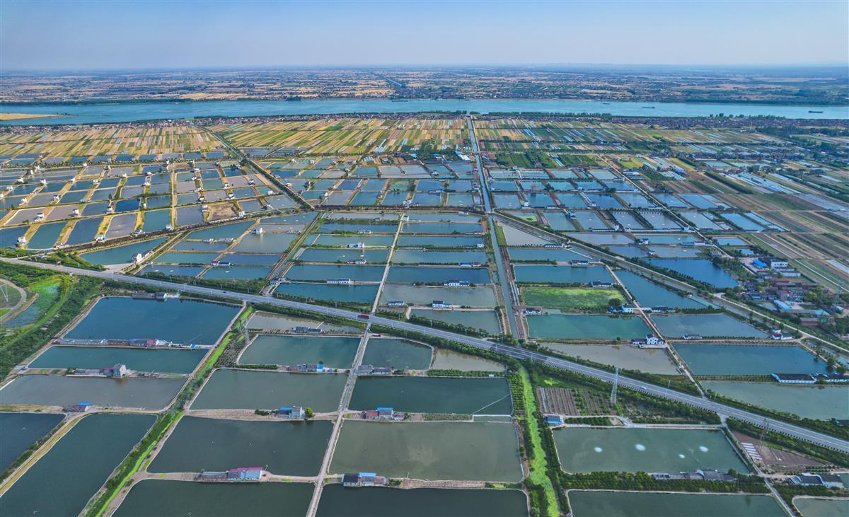 5月16日,鸟瞰长江边的枝江市金湖村的千亩鱼塘如同扑面而来的美丽画卷,星罗棋布的养殖水面波光粼粼,天上白云倒映在水面上,呈现一幅幅鸟飞鱼跃的生态美景。