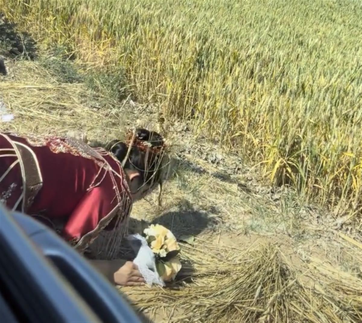 视频显示,一位手拿捧花、身穿礼服的新娘,跪在麦田边朝前方磕头祭拜。待新娘磕了两个头之后,站在一旁的新郎将新娘扶起。视频发布者配文称:“被这位新娘感动了。”