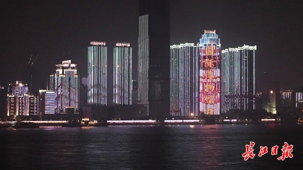 长江为画轴,光影为画笔。18日晚,《江汉揽胜图》《千里江山图》《迎宾出行图》《丝路山水地图》四幅山水名卷和世界知名博物馆建筑轮廓、精品文物以及“国际博物馆日”“博物馆的力量”等主题标语依次在长江灯光秀上演,惊艳了武汉两江四岸25公里岸线,展示了博物馆之夜的活力。
