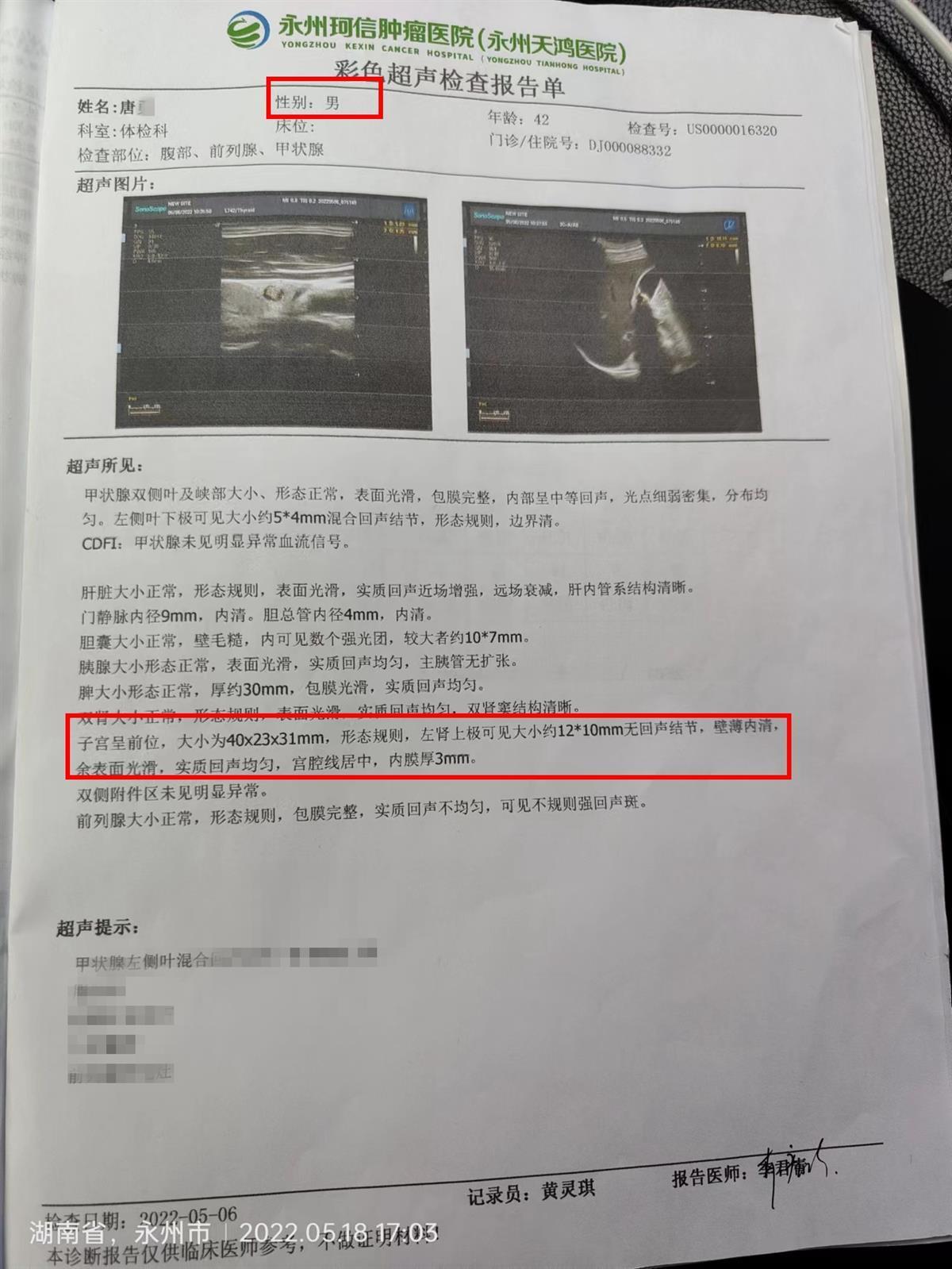 19日,极目新闻记者联系上当事人唐先生,他告诉记者确实体检时被查出有子宫,当时他吓得一天没有吃饭。唐先生介绍,他今年40多岁,平时经常喝酒,看到湖南永州天鸿医院的体检只需要398元,他就去做了一下,想了解自己的身体状况怎样,没想到发生这样的事情。