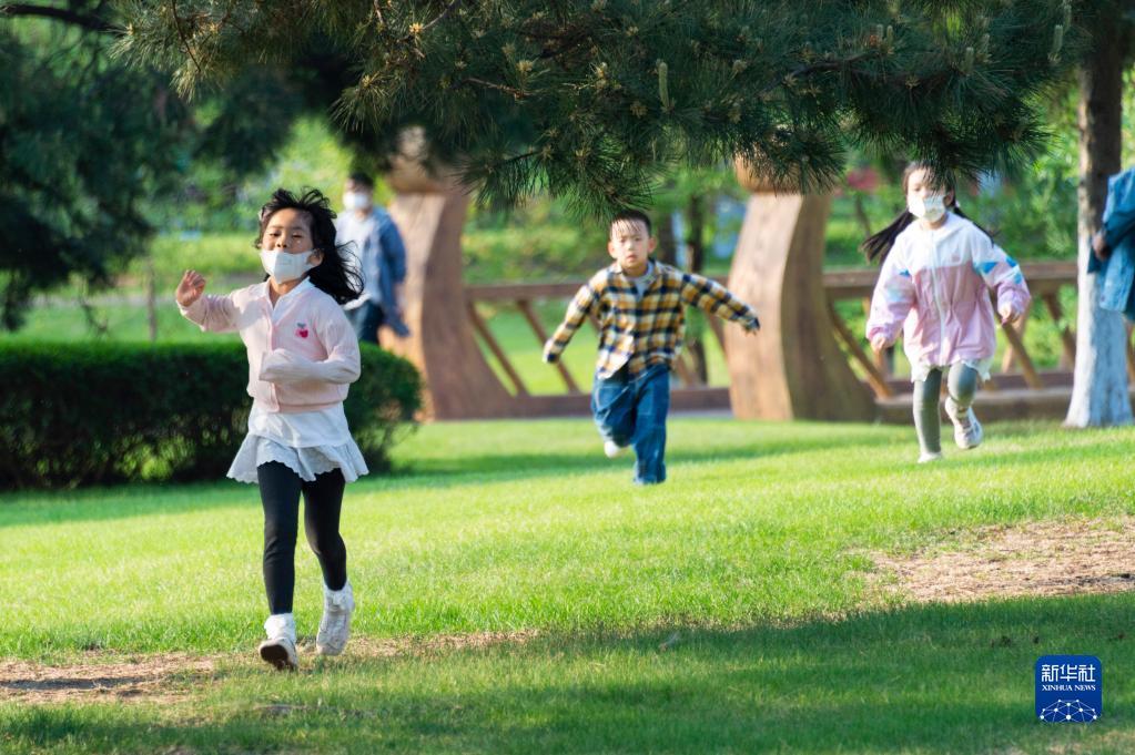 5月19日,小朋友在哈尔滨市香坊区一公园内玩耍。
