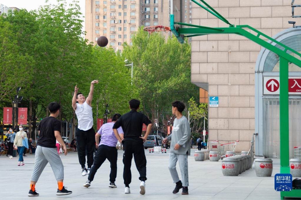 5月19日,市民在哈尔滨市香坊区一大型商场外打篮球。